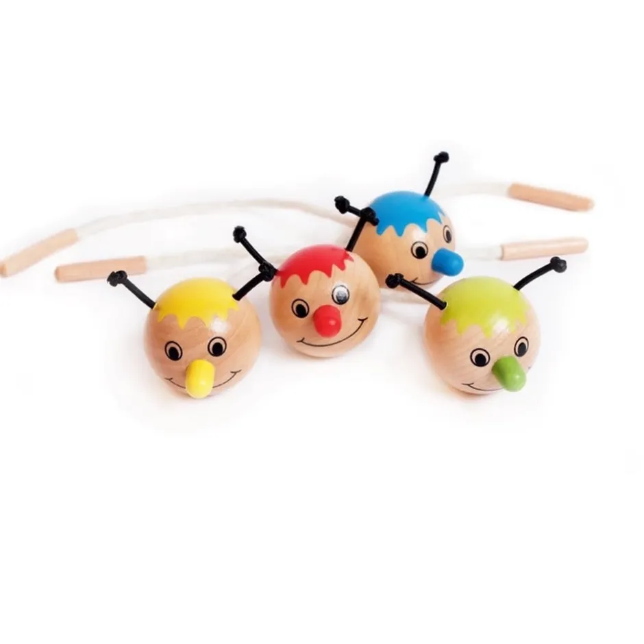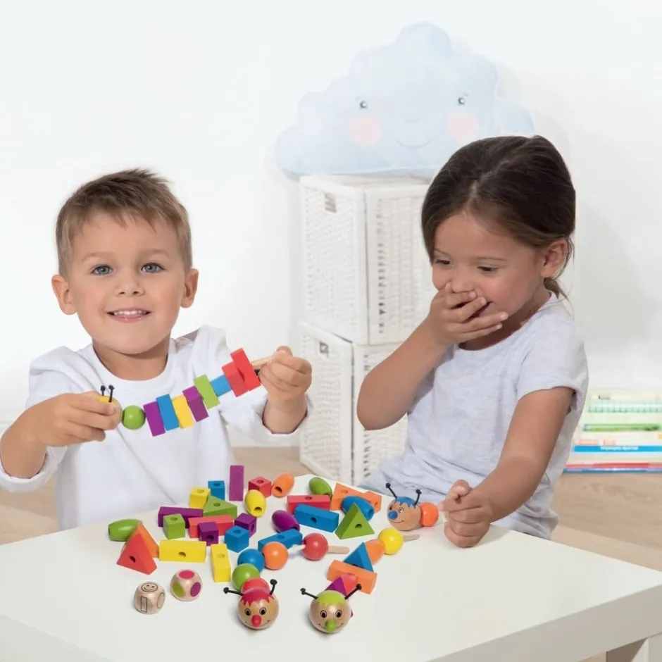 Les enfants doivent trouver les bons de différentes formes en bois dans différentes couleurs. Les deux dés indiquent la combinaison des pièces qui doivent être enfilées sur la chenille. Celui qui a réussi à enfiler six pièces en premier gagne.