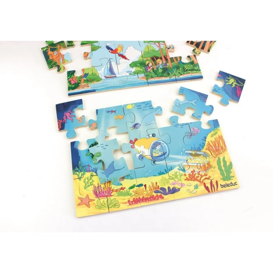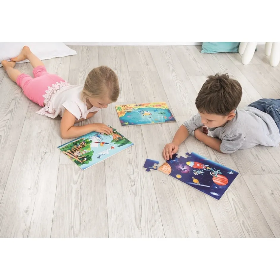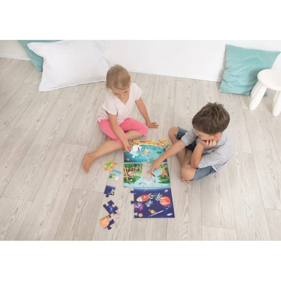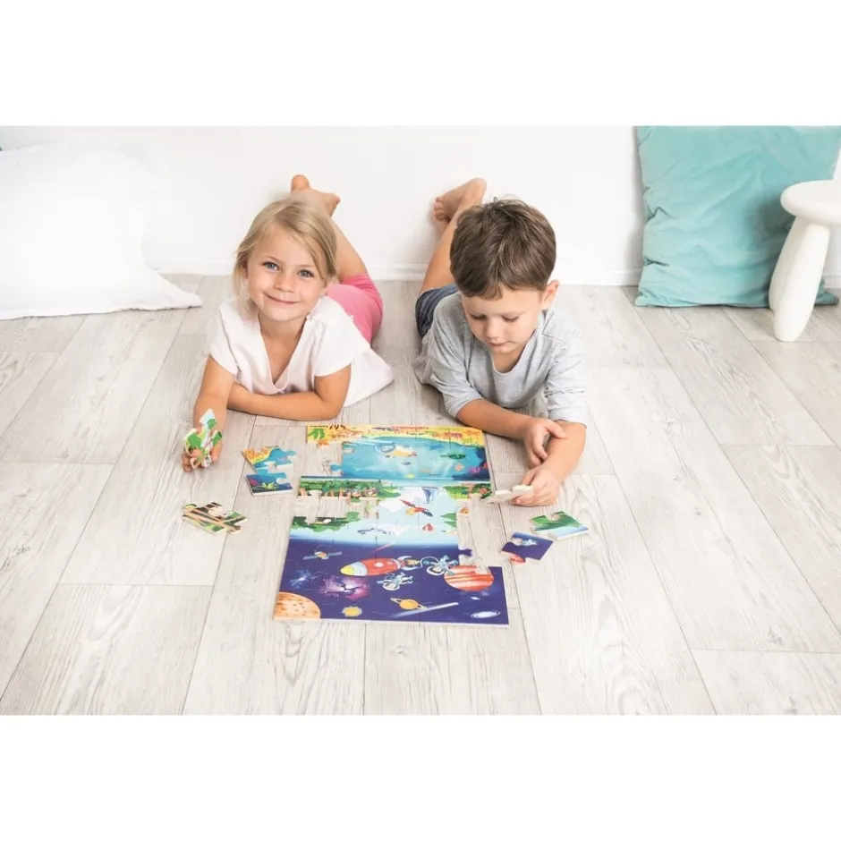 Des abysses à l’espace, ce puzzle en bois de 45 grandes pièces permettra à votre enfant de se lancer à la conquête de territoires inconnus ! Il y a tellement de choses fascinantes et instructives à découvrir dans notre monde ! En naviguant en eau profonde dans un sous-marin à la recherche de trésors marins, il pourra découvrir de nombreuses créatures intéressantes et des plantes colorées. Quels animaux se cachent parmi les arbres dans la jungle dense ? À quoi ressemble l’espace intergalactique ? Embarquez votre bout de chou pour un voyage à travers 3 couches de puzzle captivantes « Sous l’eau », « Sur le sol » et « Dans l’espace ». Chaque puzzle peut être fait séparément !