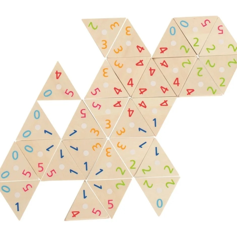 Une façon différente de jouer au domino. Ce jeu de placement fait appel à la logique et au repérage spatial. Chaque joueur reçoit le même nombre de dominos triangulaires. Le premier joueur place sur la table un Tri-Domino qui représente le sommet d’un grand triangle. Puis chaque joueur à son tour place une de ses pièces de sorte à ce que tous les chiffres adjacents soient identiques, tout en respectant la forme du triangle. Si un joueur ne peut pas jouer, il pioche et joue. Le gagnant est celui qui place le dernier élément du triangle. Selon l’âge des enfants, on décide de faire un petit ou un grand triangle, ou pas de triangle du tout dans une phase d’initiation.
