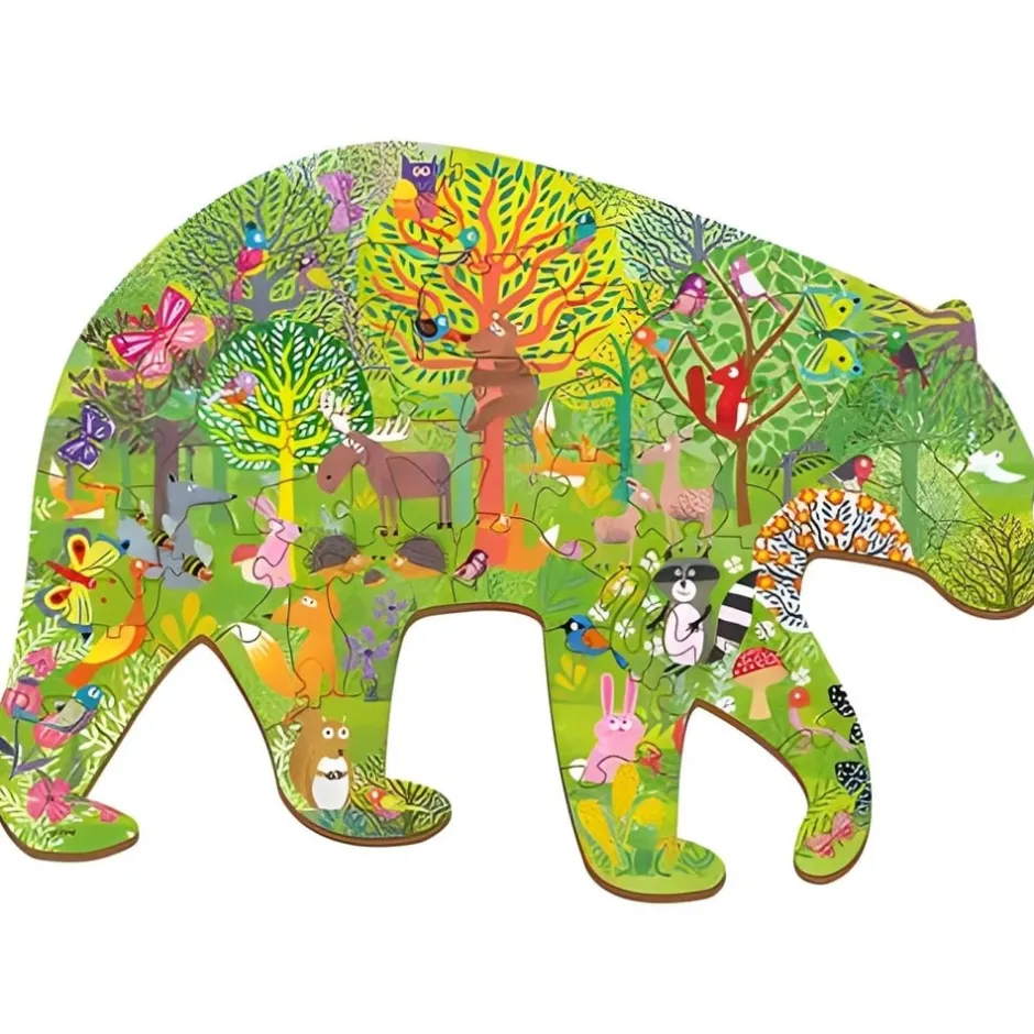 Un puzzle en bois, de fabrication italienne, en forme d’ours joliment illustré sur le thème de la forêt. Parmi les 48 pièces qui composent le puzzle, 12 animaux préformés sont à positionner. Ces animaux, d’ici ou d’ailleurs, sympathiques ou sauvages, peuvent également être enfichés dans les 12 supports de présentation qui complètent la boîte de jeu.