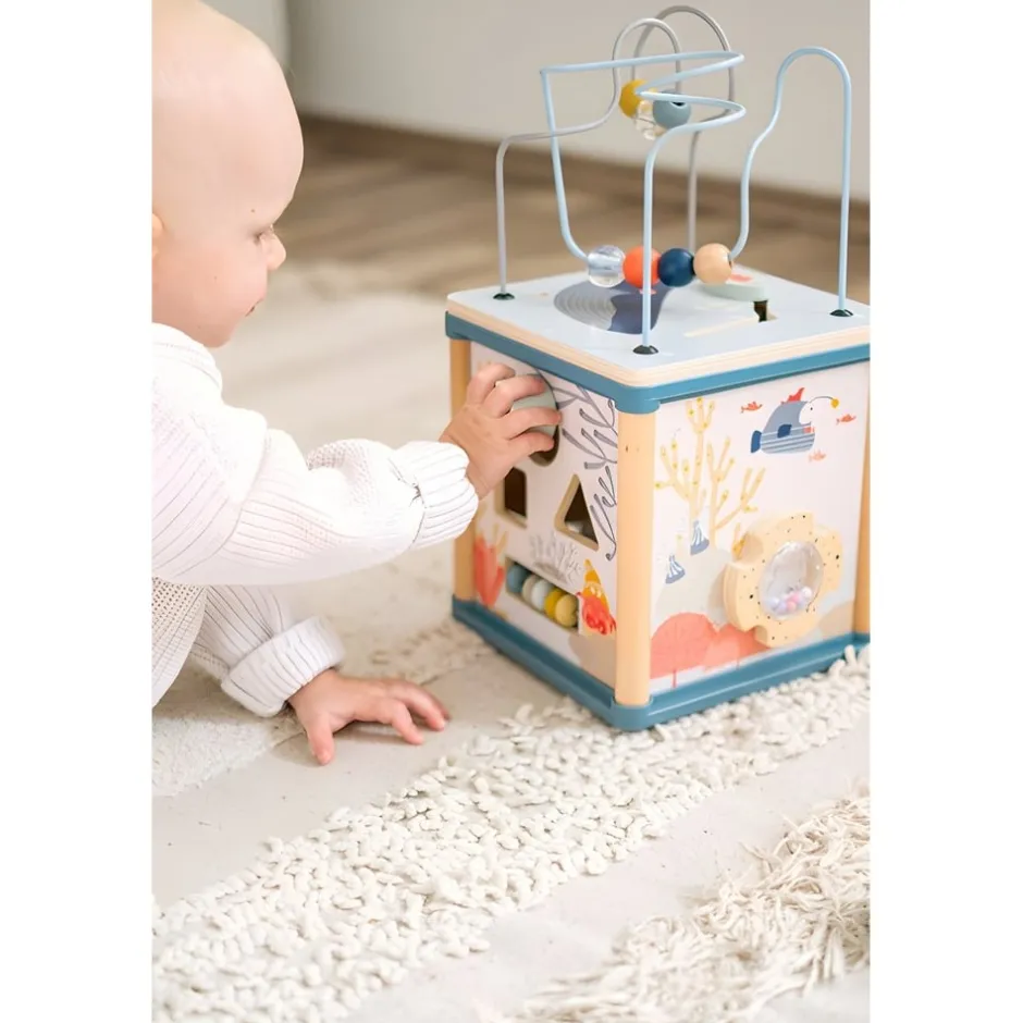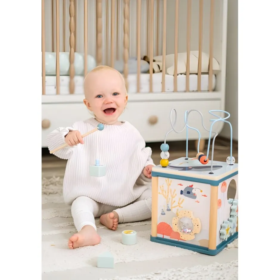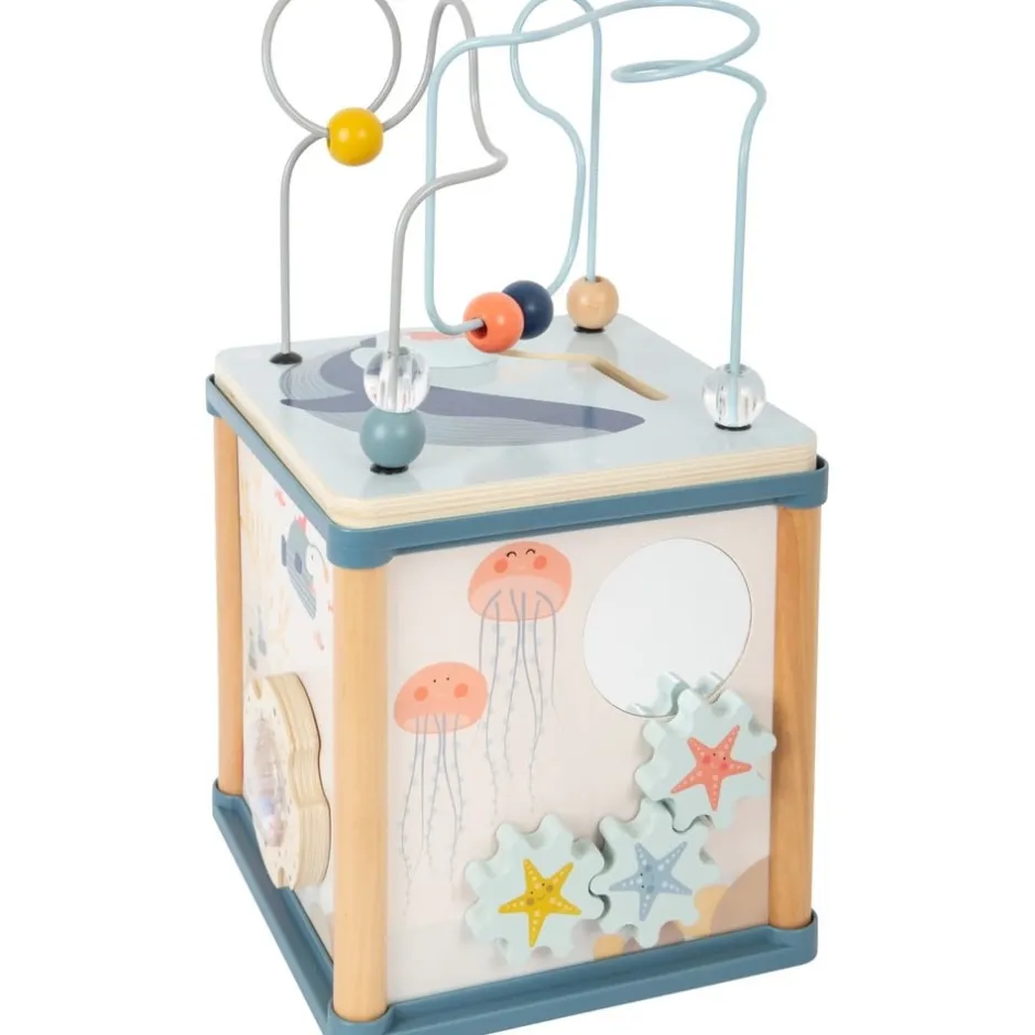 Il se passe tellement de choses sous l’eau ! Avec un circuit de motricité, un jeu de forme enfichable, un labyrinthe coulissant, un jeu de roue dentée et un hochet, ce cube de motricité en bois proposent plusieurs activités sur cinq faces jouables. Les décors délicats et le monde sous-marin encouragent les contes et permettent aux enfants de découvrir le monde des créatures marines de manière ludique. La pieuvre, dont la tête vacille joyeusement grâce à un mécanisme à ressort, apporte une part de plaisir supplémentaire. Le hublot rotatif avec ses boules de hochet colorées et le miroir sont également des points forts du jeu. Pour varier, il y a la canne à pêche incluse avec laquelle les trois modules magnétiques enfichables peuvent être pêchés. C’est une activité très amusante pour les jeunes enfants qui permet d’entraîner les capacités motrices tout en encourageant la patience.