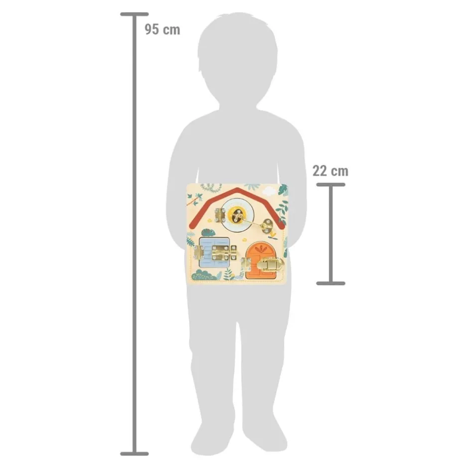 Fermer, ouvrir, découvrir ! Cette planche de motricité en bois offre aux jeunes enfants de multiples possibilités de jeu et d’apprentissage. La planche d’apprentissage au look exotique « safari » dispose de deux fenêtres et d’une porte dotées de différentes fermetures qui laissent entrevoir d’adorables animaux. En ouvrant et en fermant le verrou, le crochet de porte et le loquet, les enfants apprennent des compétences pratiques quotidiennes et développent leurs capacités motrices fines.