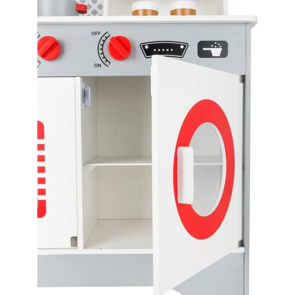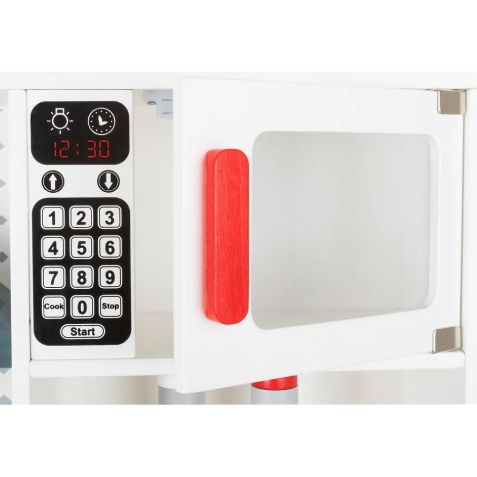 On en a l’eau à la bouche ! Cette cuisine équipée a tout pour séduire. Plaques lumineuses et boutons émettant le bruit caractéristique des gazinières, un four, un micro-ondes et différents ustensiles pour préparer ses plats préférés. En plus, il y a même une machine à laver. Une cuisine que l’on ne souhaite plus quitter ! Piles non incluses.