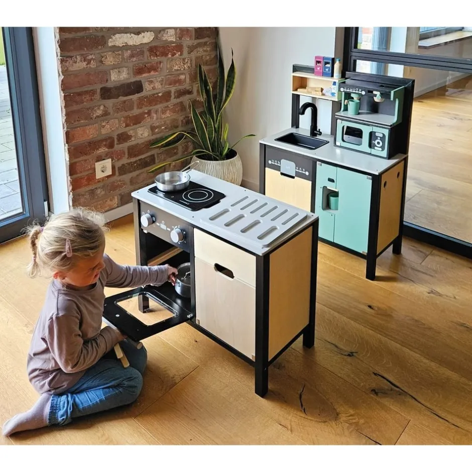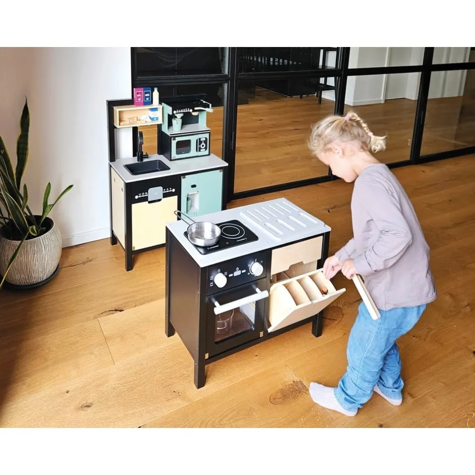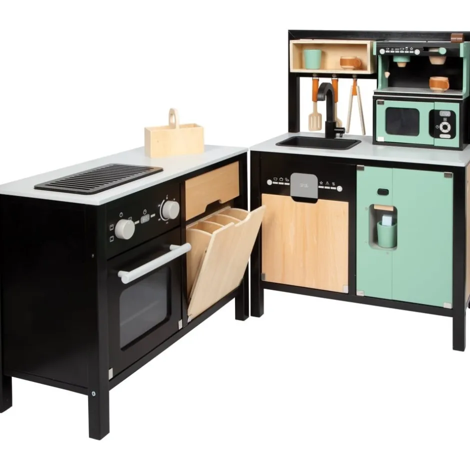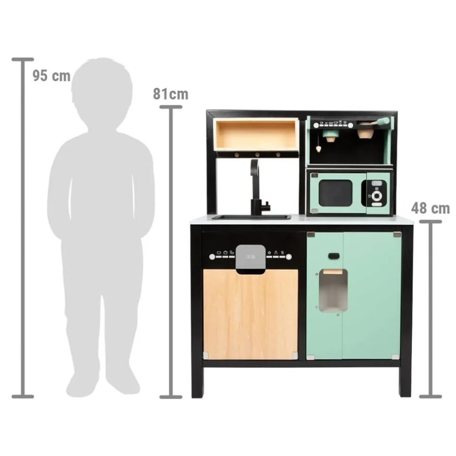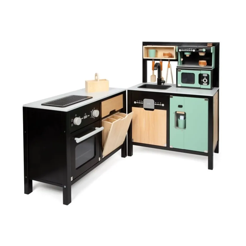 Avis aux chefs de cuisine ! Cette grande cuisine pour enfants très bien équipée offre tous les appareils d’un ménage moderne avec cuisinière/gril, évier, four, lave-vaisselle, micro-ondes, machine à café, système de tri des déchets et réfrigérateur avec distributeur de glaçons. Grâce à son système modulaire, elle peut être utilisée en angle, comme kitchenette ou comme cuisine avec îlot de travail et offre à plusieurs enfants à la fois de la place pour des jeux de rôle créatifs. La machine à café et le distributeur de glaçons fonctionnel intégré au réfrigérateur constituent des points forts particuliers. Des boutons rotatifs avec des bruits de clic garantissent également un plaisir de jeu proche de la réalité. Inclus : une poêle, une casserole avec couvercle, trois ustensiles de cuisine, deux tasses à café, trois rondelles à café, deux gobelets et trois cubes en bois. Le look industriel moderne, souligné par une construction de cadre noire stylée, attire tous les regards sur cette cuisine de jeu en bois.