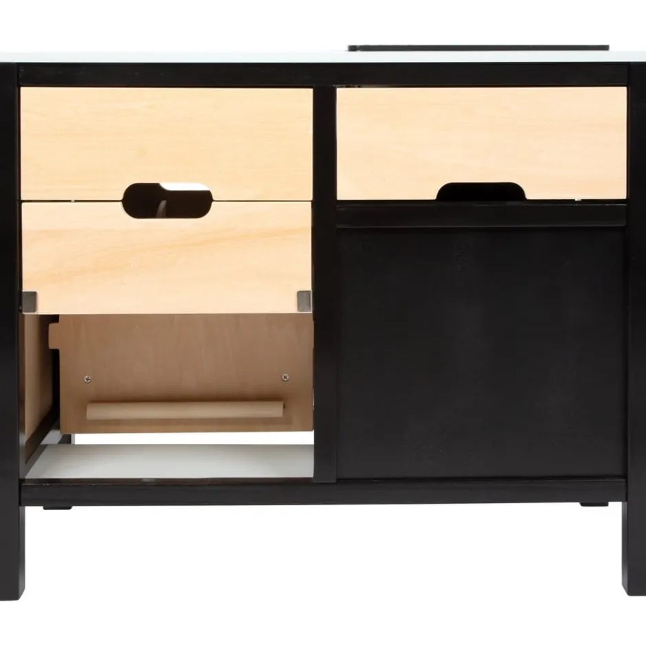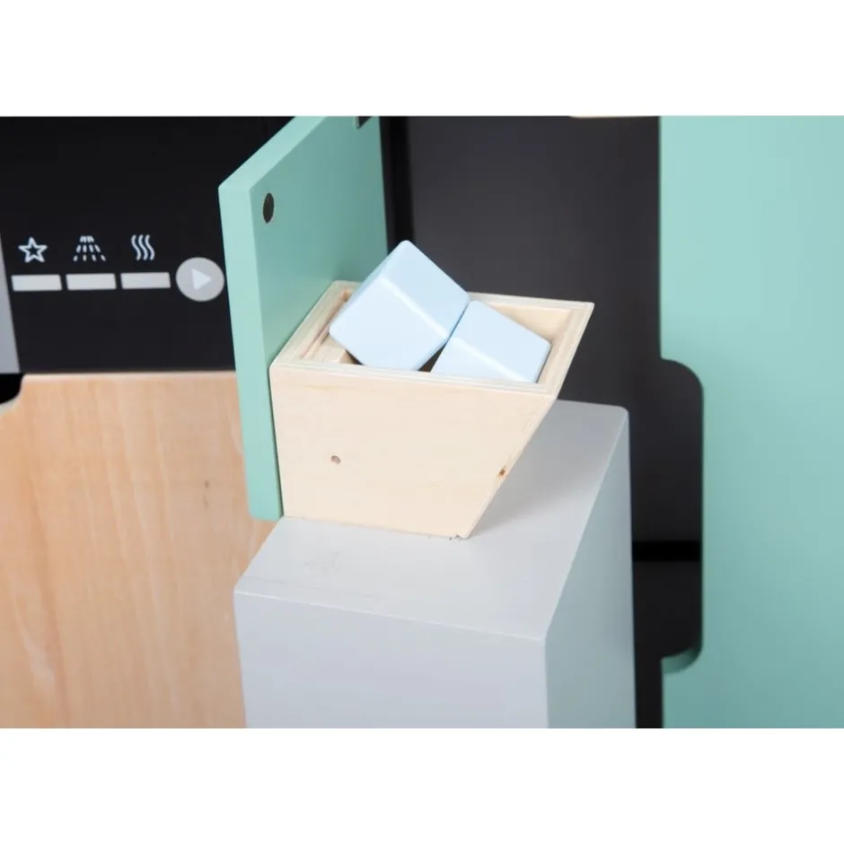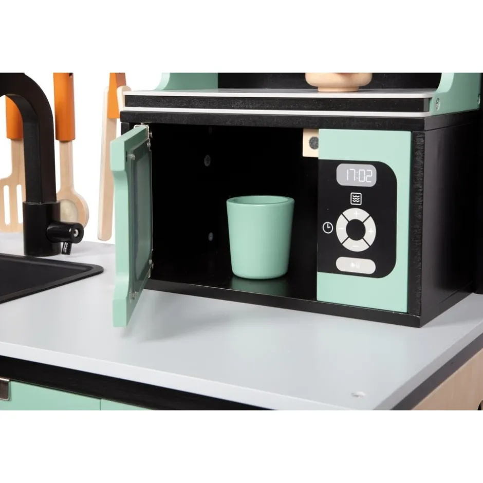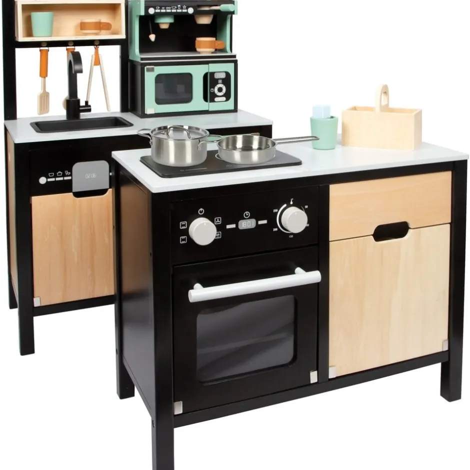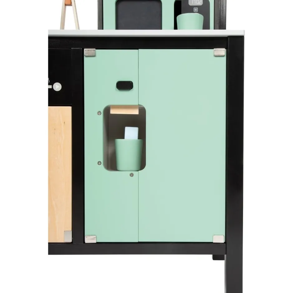 Avis aux chefs de cuisine ! Cette grande cuisine pour enfants très bien équipée offre tous les appareils d’un ménage moderne avec cuisinière/gril, évier, four, lave-vaisselle, micro-ondes, machine à café, système de tri des déchets et réfrigérateur avec distributeur de glaçons. Grâce à son système modulaire, elle peut être utilisée en angle, comme kitchenette ou comme cuisine avec îlot de travail et offre à plusieurs enfants à la fois de la place pour des jeux de rôle créatifs. La machine à café et le distributeur de glaçons fonctionnel intégré au réfrigérateur constituent des points forts particuliers. Des boutons rotatifs avec des bruits de clic garantissent également un plaisir de jeu proche de la réalité. Inclus : une poêle, une casserole avec couvercle, trois ustensiles de cuisine, deux tasses à café, trois rondelles à café, deux gobelets et trois cubes en bois. Le look industriel moderne, souligné par une construction de cadre noire stylée, attire tous les regards sur cette cuisine de jeu en bois.