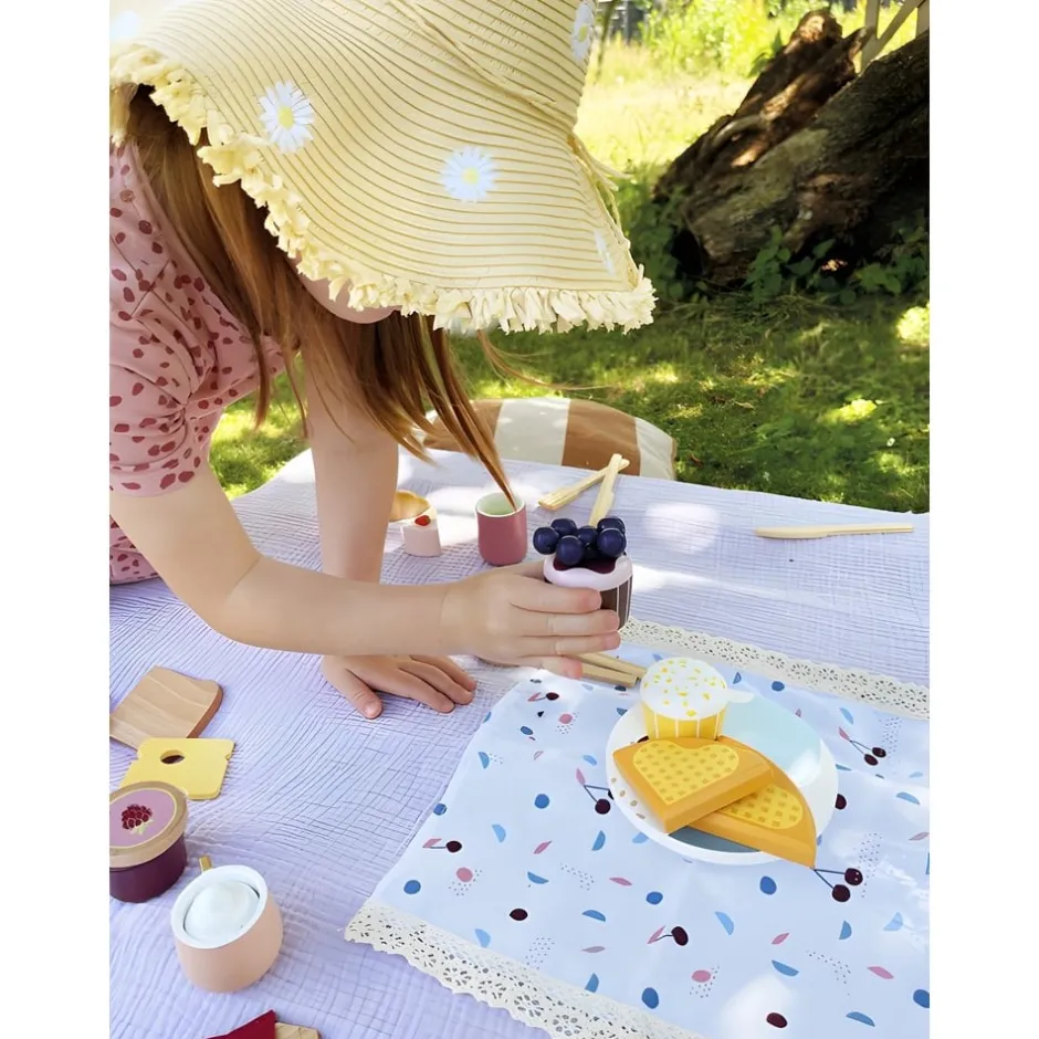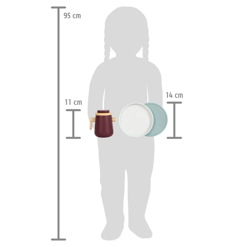 Avec ce service à thé moderne, le design scandinave fait son entrée dans la cuisine des enfants ! Le set de jeu complet pour deux personnes comprend, outre des tasses, des assiettes, des cuillères à café, un sucrier et un pot à lait, de nombreux aliments ludiques comme de la crème, des sachets de thé, des myrtilles, des muffins et des couvercles à boisson en bois. La crème et les myrtilles peuvent être placées sur les muffins grâce aux aimants ou combinées avec les boissons. Les couvercles du pot à lait et du sucrier sont amovibles. La fonction magnétique intégrée invite à un jeu de rôle actif, tout comme le plateau joliment décoré sur lequel toutes les friandises trouvent leur place.