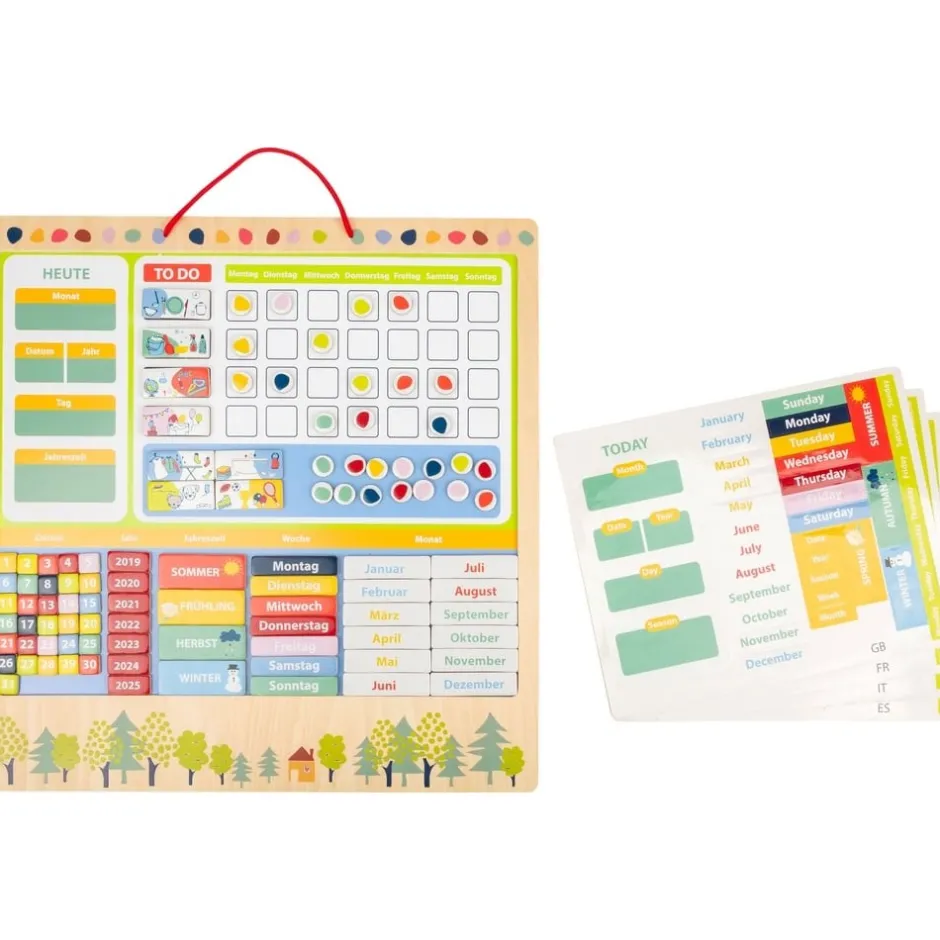 Ce calendrier magnétique perpétuel se compose d’un tableau aimanté et de 92 pièces magnétiques (nombres de 1 à 31, 7 années, 4 saisons représentées par des illustrations colorées, 12 mois de l’année, 7 jours de la semaine, 8 activités/tâches de la vie courante dessinées et symbolisées, des jetons colorés). Ce calendrier en langue allemande est livré avec des plaquettes d’autocollants en français, anglais, italien et espagnol qui permettent ainsi de le personnaliser dans la langue souhaitée. Il peut donc être utilisé pour l’initiation à une langue étrangère comme pour l’apprentissage du français pour les plus petits.