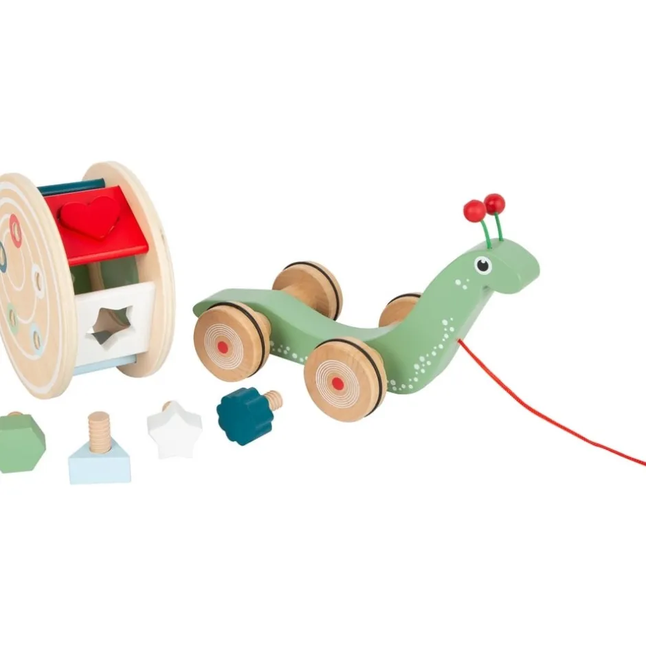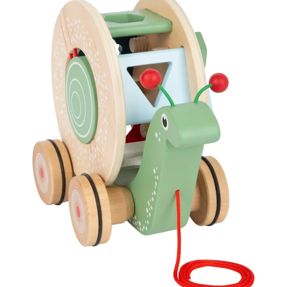 - un escargot, monté sur 4 roues caoutchoutées, à tirer par la ficelle rouge fixée sous sa tête ;