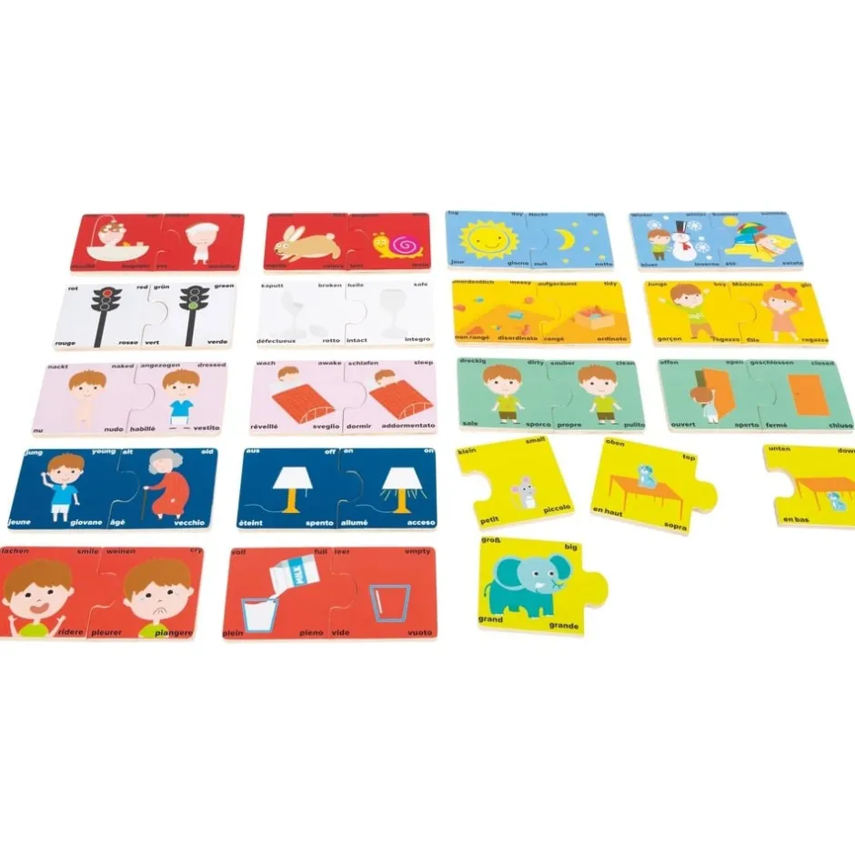 Avec ce puzzle éducatif en bois, votre enfant pourra commencer son apprentissage et entrainer sa compréhension de la notion d’opposé. En comparant les objets, les actions et les scènes de vie présents sur les cartes puzzles en bois, en observant les détails et leurs caractéristiques, il pourra partir à la découverte de son environnement et du monde qui l’entoure. Ce puzzle didactique est un outil pédagogique idéal pour enrichir son vocabulaire, pour réussir à mettre des mots sur certains attributs, propriétés des objets, lieux ou personnes. Il devra reconstituer les paires en suivant les indices (couleur, illustration) qui le guideront. Chaque paire de contraire à constituer développera son sens de l’observation, sa patience, sa concentration, son langage, ses capacités d’association et de compréhension.
