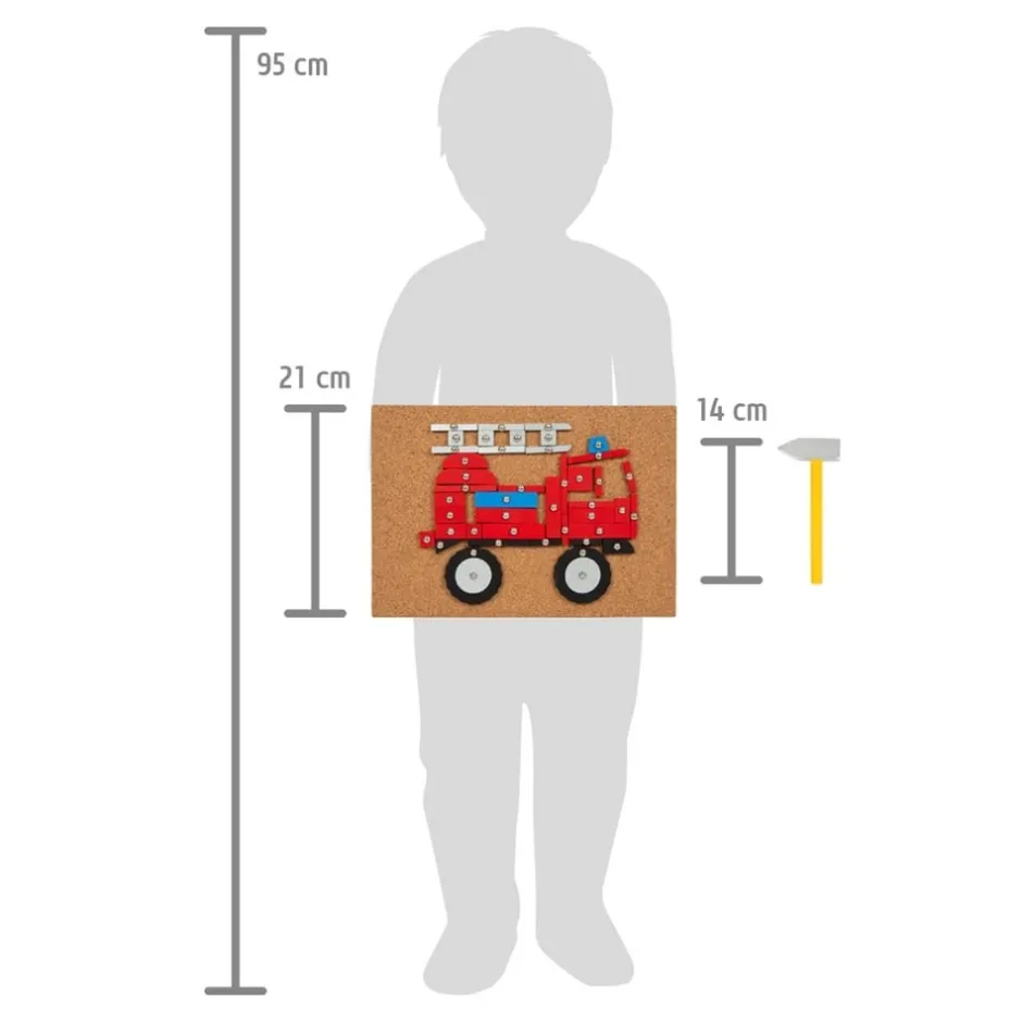 Ensemble créatif complet sur le thème de la mobilité, des véhicules et des scènes de l’environnement urbain ! Équipé d’une planche en liège, d’un marteau en bois, de clous décoratifs et de nombreux éléments en bois stratifié, ce jeu de marteaux permet de créer de nombreux motifs.
