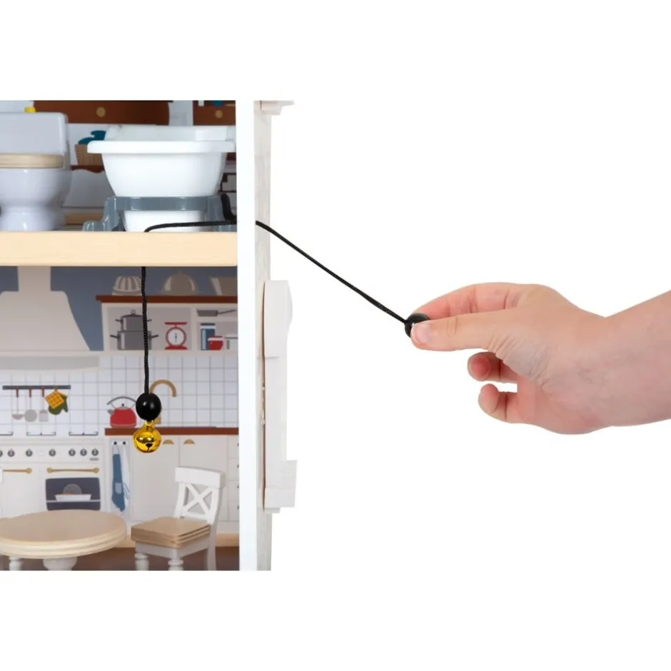 Cette très coquette maison de poupée en bois se compose d’une cuisine agréable pouvant servir de salle à manger, d’un salon confortable situé au rez-de-chaussée, d’une salle de bain et d’une chambre d’enfant située au premier étage, d’une chambre à coucher et d’une loggia au deuxième étage accessibles par un magnifique escalier. Cette maison de poupée en bois à la façade ouverte et aux couleurs modernes compte 12 éléments de mobilier (lits, tables, chaises, fauteuil, canapé, baignoire, toilette) et des accessoires tels que des coussins, couettes, sonnette, porte coulissante, fenêtres à ouvrir … La façade ouverte de ce joli manoir, convenant aux poupées jusqu’à 12 cm de hauteur, facilite l’accès aux différents éléments et le rend de plus très agréable à jouer.
