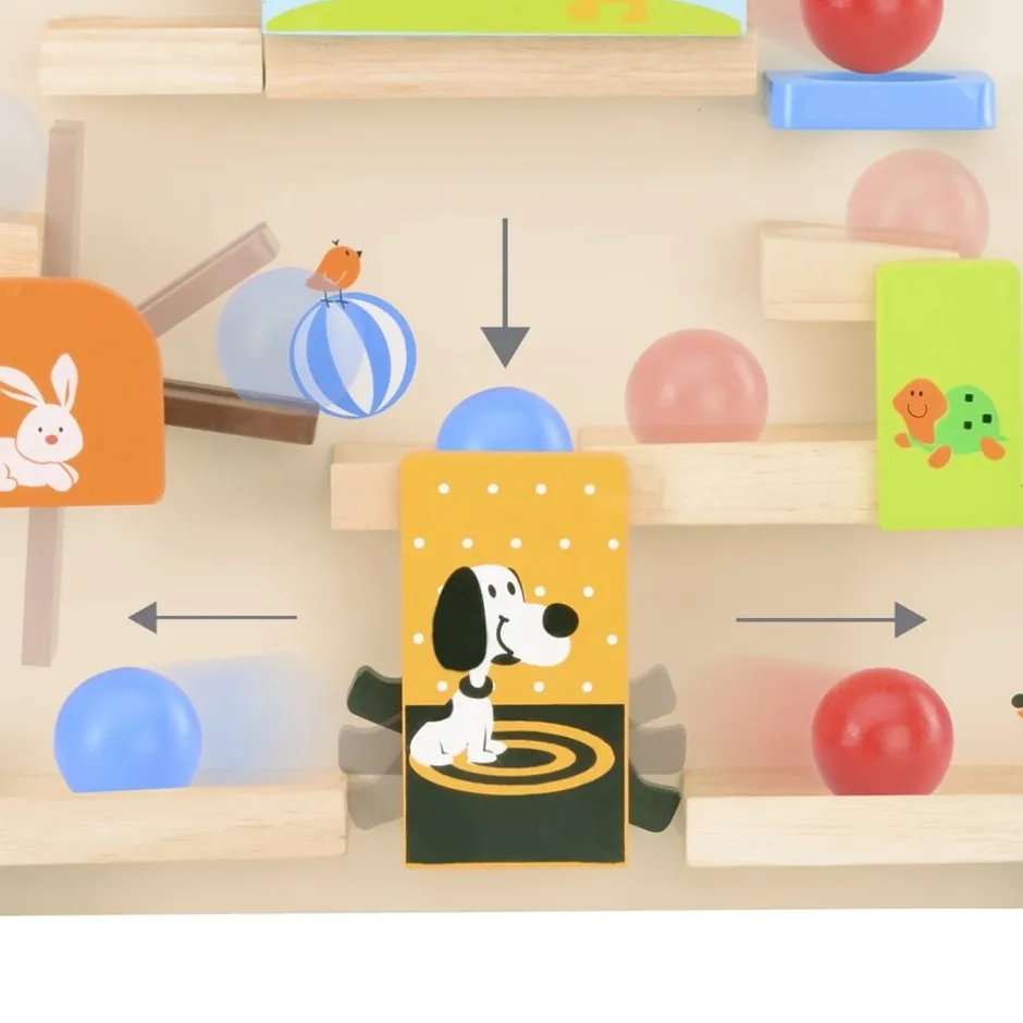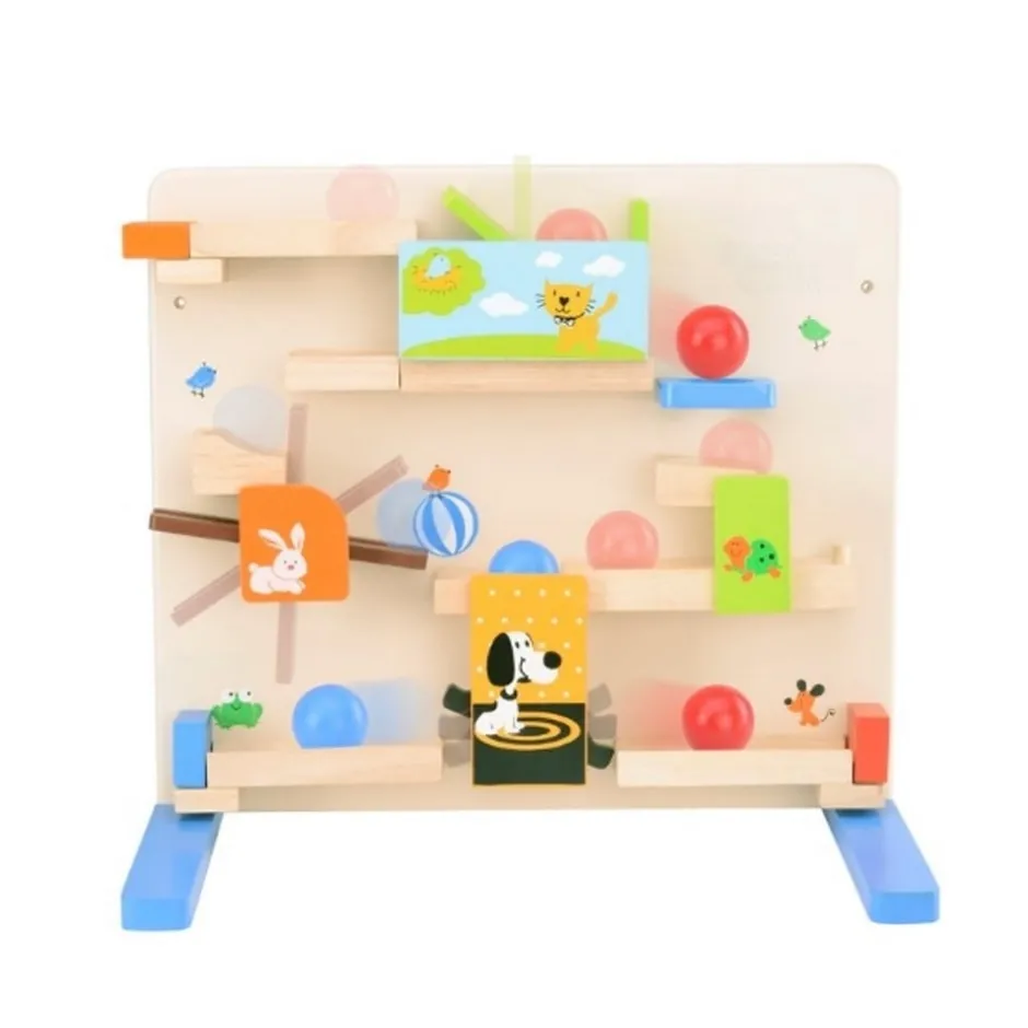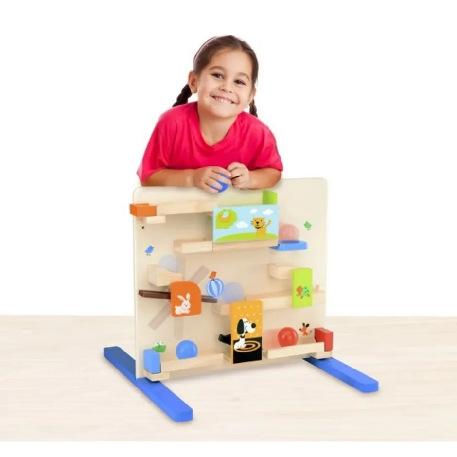 Votre enfant pourra éprouver la satisfaction de réussir à positionner la bille au point de départ, puis aura un plaisir émerveillé à voir cette bille rouler et franchir aisément la trappe qui l’enverra tantôt à gauche tantôt à droite, l’entonnoir, la grande rampe à bascule qui la propulsera vers le répartiteur qui permettra enfin à la bille d’atteindre la ligne d’arrivée. Avec ce jouet en bois, votre enfant pourra jouer seul et éprouvera assurément une satisfaction non dissimulée à vous montrer ces progrès et sa capacité à mettre sa bille en mouvement sur ce joli toboggan en bois.