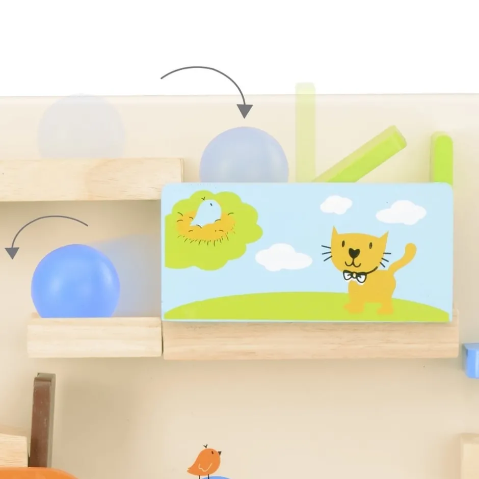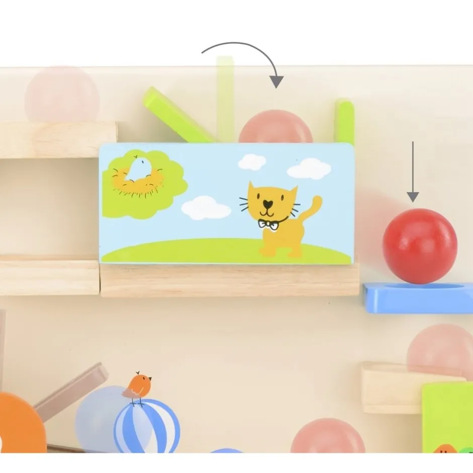 Ce circuit à billes est le parfait jeu en bois pour les plus jeunes pour entraîner leur observation et leur motricité fine, mais aussi pour comprendre la relation de cause à effet. Ce circuit à billes en bois préassemblé peut être fixé à un mur ou positionné sur ces deux grands pieds de maintien qui le rendent extrêmement stable. Il se compose de 4 obstacles et 2 billes colorées en bois de gros diamètres (pour éviter tout risque d’étouffement).