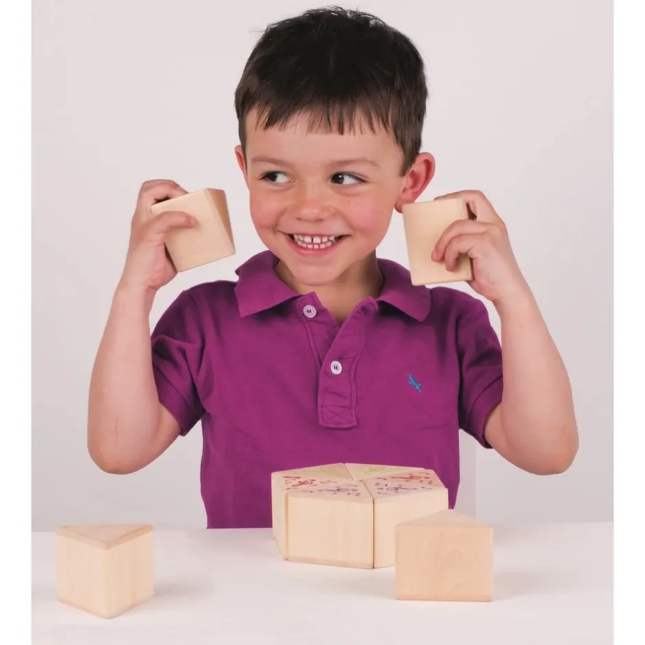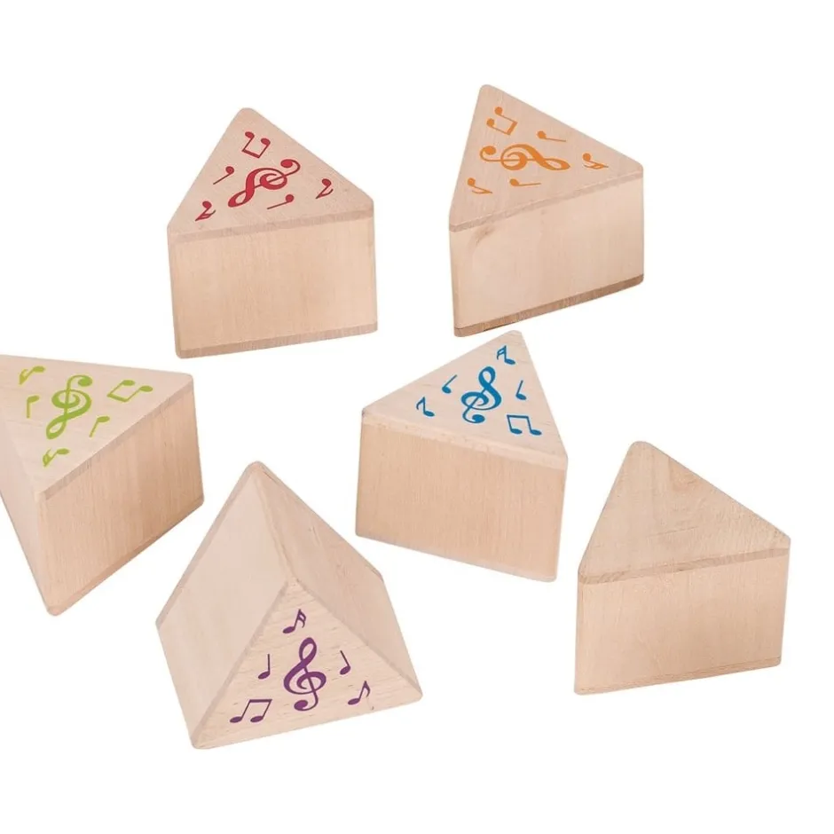 Ce jeu de société en bois comporte 12 prismes 6,7 x 6,7 x 5,8 cm en bois qui forment 6 paires de sons différents. Ces prismes ont donc deux à deux, le même son. Chacun porte, sur une de ses faces triangulaires, le dessin d’une clé de musique colorée. Les deux éléments d’une même paire présentent un symbole coloré identique. Il faut apparier les sons identiques après les avoir mêlés face colorée cachée. Comme un mémo visuel, à chacun son tour on se saisit d’une pièce que l’on agite pour en reconnaître le son. Le jeu consiste à reconstituer les paires en mémorisant les sons. Si l’on trouve une paire du premier coup on la conserve, sinon on mémorise et on repose les deux pièces. Le but du jeu étant de retrouver le plus grand nombre de paires ayant le même son.