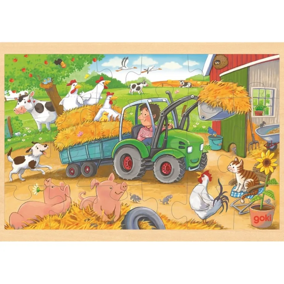Dès 3 ans, il pourra essayer de le résoudre et développera ainsi sa coordination œil-main, son sens de l’observation et de la déduction et sa mémoire visuelle. Il devra sélectionner et assembler les pièces une à une. Pour cela, il lui faudra les observer soigneusement. La pièce a-t-elle un ou deux bords droits ? Combien a-t-elle de creux et d’excroissances ? Quelle est sa couleur ? Puis-je y distinguer une partie d’un animal, d’une fleur, d’un arbre, d’un fruit, du fermier, du tracteur… Cette analyse des pièces lui permettra de les trier et les organiser : celles qui permettent de faire le contour, celles qui s’assemblent pour former les cochons par exemple, celles qui vont en haut car représentent le ciel… Avec ce puzzle en bois, votre bout de chou devra faire preuve de méthode et de rigueur pour ne pas risquer de s’épuiser avec des essais successifs aléatoires souvent infructueux. C’est une activité calme qui lui demandera d’être patient, concentré et autonome pour reconstituer le puzzle et découvrir le monde de la campagne en apprenant de nouveaux mots de vocabulaires et connaissances.