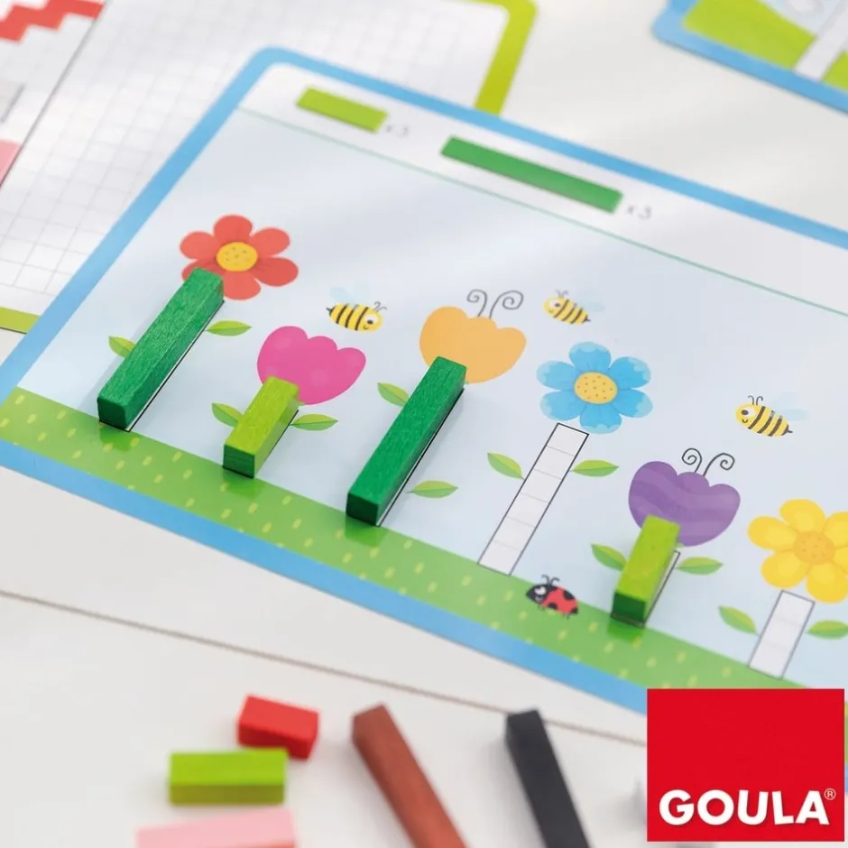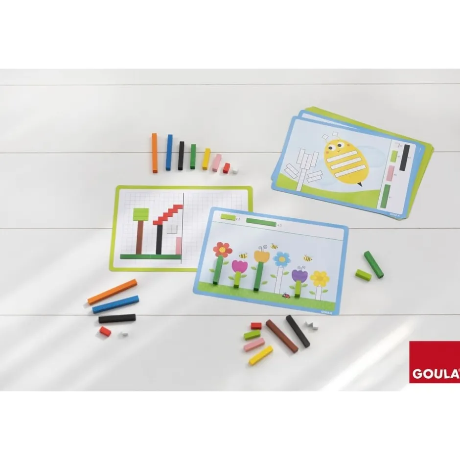 Le but est de compléter les fiches les unes après les autres en utilisant les réglettes. Une fois la fiche complétée, retirer les réglettes pour compléter une nouvelle fiche. Permet de se familiariser avec les nombres et concepts mathématiques. Développe la logique et la concentration. Deux types de jeux selon la couleur des fiches.