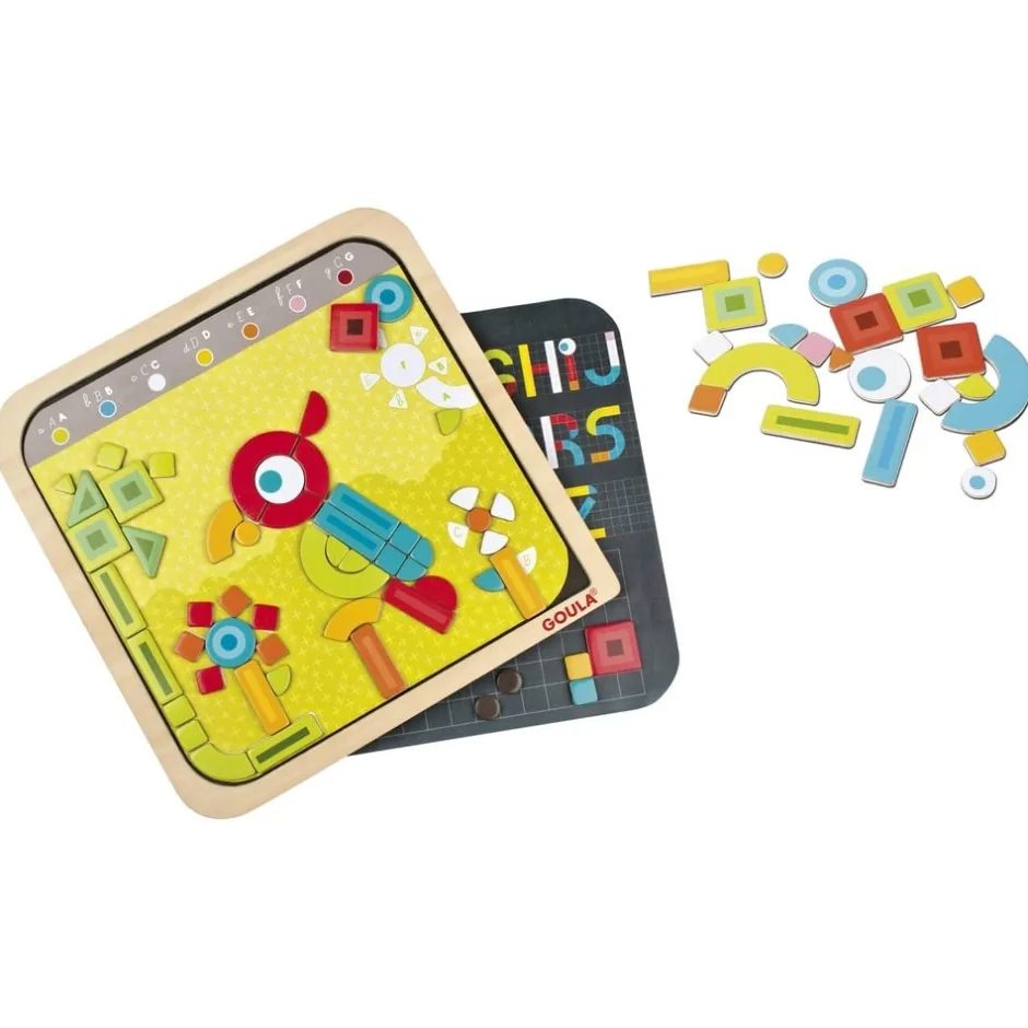 Ce coffret dessin se compose d’un tableau ardoise magnétique, de 120 pièces en bois aimantées de différentes couleurs et formes, de 6 fiches d’activités recto verso magnétiques (soit 12 activités, dont l’apprentissage de l’alphabet, des chiffres, des formes, l’univers marin, la ville…), une craie pour dessiner ou écrire sur l’ardoise. Votre enfant pourra suivre les fiches d’activité pour disposer les pièces sur le tableau et composer les dessins proposés ou bien faire tout simplement appel à sa créativité et son imagination.