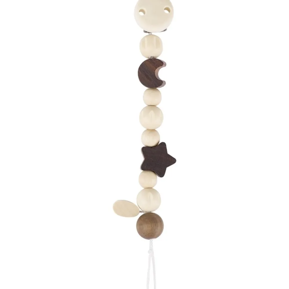 Cet accroche tétine-Astre en bois avec ses deux essences de bois dans leur plus simple appareil, au naturel, est magnifique. Les perles en bois de hêtre, les petites lunes et les étoiles d’érable, s’alternent le long de la cordelette rigide offrant une douce harmonie à cet accessoire indispensable de jour comme de nuit. Un attache tétine écologique qui s’accroche aussi bien aux vêtements de votre bébé qu’à son body, son doudou, sa poussette ou qu’au siège auto. Il assimilera bien vite que son objet préféré, qui le calme, le rassure et le sécurise, se situe au bout de cette jolie petite chainette et en voulant le récupérer et le mettre dans sa bouche, votre bout de chou travaillera sa dextérité et sa coordination œil-main. Avec notre accroche sucette, cet objet presque magique, réconfortant, apaisant et rassurant, ne risque plus de trainer dans la poussière ou encore pire, de se perdre.