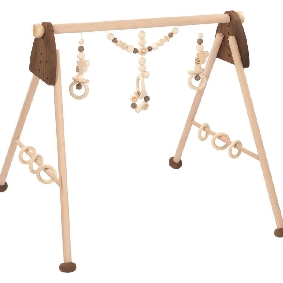 Ce portique d’activités, adapté aux bébés dès 3 mois, stimulera votre petit ange dans son développement, son renforcement musculaire et son apprentissage. Avec sa forme particulière, aux couleurs boisées et naturelles, ces patins en bois qui offrent de la stabilité à la structure de jeux, ses trois hochets suspendus agrémentés de différentes sortes de perles (grosses, plus petites, customisées), d’anneaux rigides et de pièces taillées en écureuil, votre bébé aura sa salle de gymnastique personnelle : différentes formes, différents éléments pour différents sons et différentes hauteurs de suspension pour obliger bébé à progresser en motricité en lui donnant envie de se mouvoir pour attraper ses jolis objets suspendus ou encore les anneaux en bois rigides accrochés sur les côtés entre les pieds du portique d’activités et les découvrir. Le portique d’activités participe également activement au développement des perceptions sensorielles du bébé en lui faisant découvrir des formes, des couleurs et des bruits différents et nouveaux.