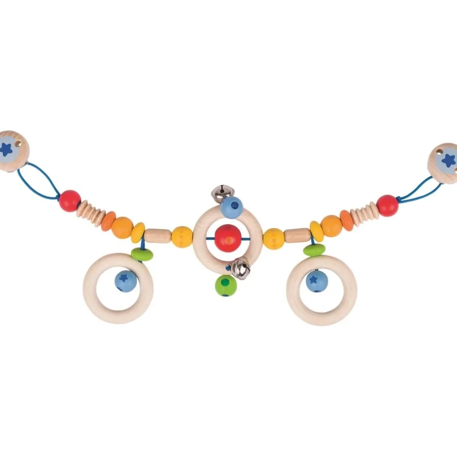 C’est un petit arc-en-ciel de couleurs qui se présente à votre bébé avec cette jolie chaîne de décoration en bois pour poussette. Il y a tant de détails à découvrir sur cette chaîne décorative avec ses pièces de bois de différentes formes, tailles, couleurs et finitions, ses trois petits anneaux de bois naturel et ses petits grelots. Tant d’éléments qui donneront à votre bébé l’envie de les toucher, de les attraper, de jouer avec, de les triturer dans tous les sens. Et lorsqu’il aura compris que les deux petits grelots accrochés à cette chaîne de poussette dégagent un doux tintement, votre enfant ne se lassera plus de les secouer. Cette décoration de poussette stimulera et éveillera ses sens en douceur pour le familiariser avec les formes, les textures, les sons, les couleurs… Un début dans son exploration du monde qui l’entoure. Grâce aux deux clips qui la surmonte, cette chaîne décorative peut facilement s’accrocher à la poussette de votre bébé, mais pas exclusivement. Ce jouet d’éveil décoratif en bois s’adapte, alors vous pourrez clipser cette chaîne pour poussette où bon vous semblera.