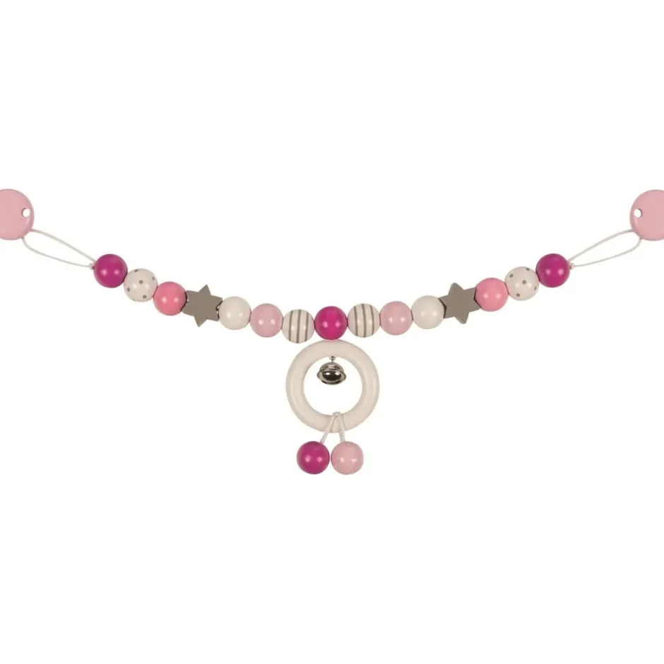 Cette chaîne de poussette en bois suscitera la curiosité de votre bébé et participera à l’éveil de ses sens. Cet accessoire est très joli avec ses petites perles de bois décorées dans les tons roses, gris et beiges, taillées en forme d’étoile pour certaines, et son anneau en bois rigide accroché, agrémenté de deux perles suspendues. Cet accessoire pour poussette accompagnera votre bébé dans toutes ses sorties. Il se promènera au son du grelot, pourra tenter de toucher, attraper, tourner, secouer les petites perles, le grelot et l’anneau de la chaîne avec ses mains ou sa bouche pour découvrir ces nouveaux objets, leurs textures et leurs formes. C’est en explorant cette chaîne décorative pour poussette, en la manipulant, en l’inspectant de part et d’autre que votre bébé entrainera ses petites mains, gagnera en motricité fine et améliorera sa coordination œil-main.