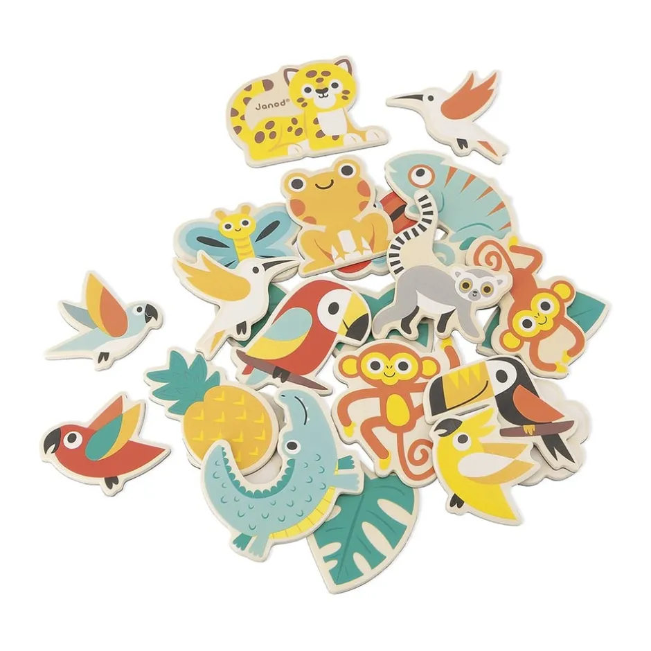 Des envies d’évasion et de vacances ? Donnez à toutes vos surfaces magnétiques un look exotique avec ses 24 magnets en bois ! Retrouvez dans ce set de magnets : perroquets, crocodiles, jaguars, caméléons, lémuriens, singes et plus encore ! Des aimants parfaits pour les tableaux des enfants ou le réfrigérateur par exemple ! On décore, on imagine des histoires au cœur de la jungle tropicale… Ce lot de 24 magnets en bois convient aux enfants dès 2 ans.