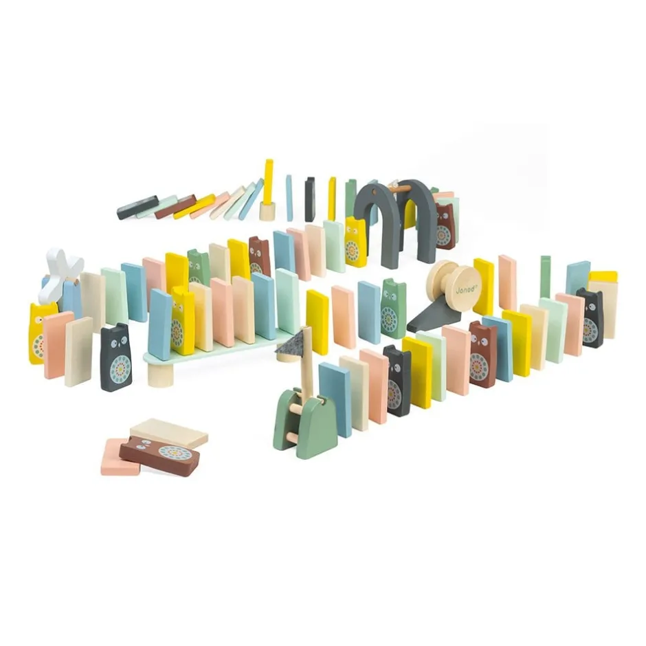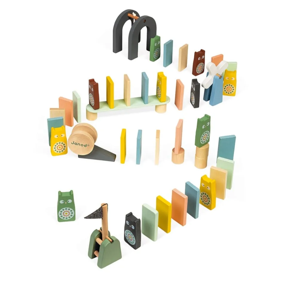 Ce jeu de construction en bois contient 100 pièces, dominos classiques, domino en forme de hiboux et obstacles (moulin, plot, pont, arche à clochette, drapeau à levier, bobine et pente), à aligner pour former un parcours. Le but du jeu est d’en utiliser un maximum pour les faire s’écrouler les uns sur les autres sous l’effet de la gravité et du poids en poussant l’une des extrémités du parcours. Par lien de cause à effet, aucun domino en bois ne doit rester debout !