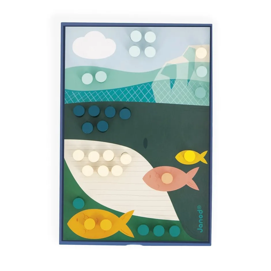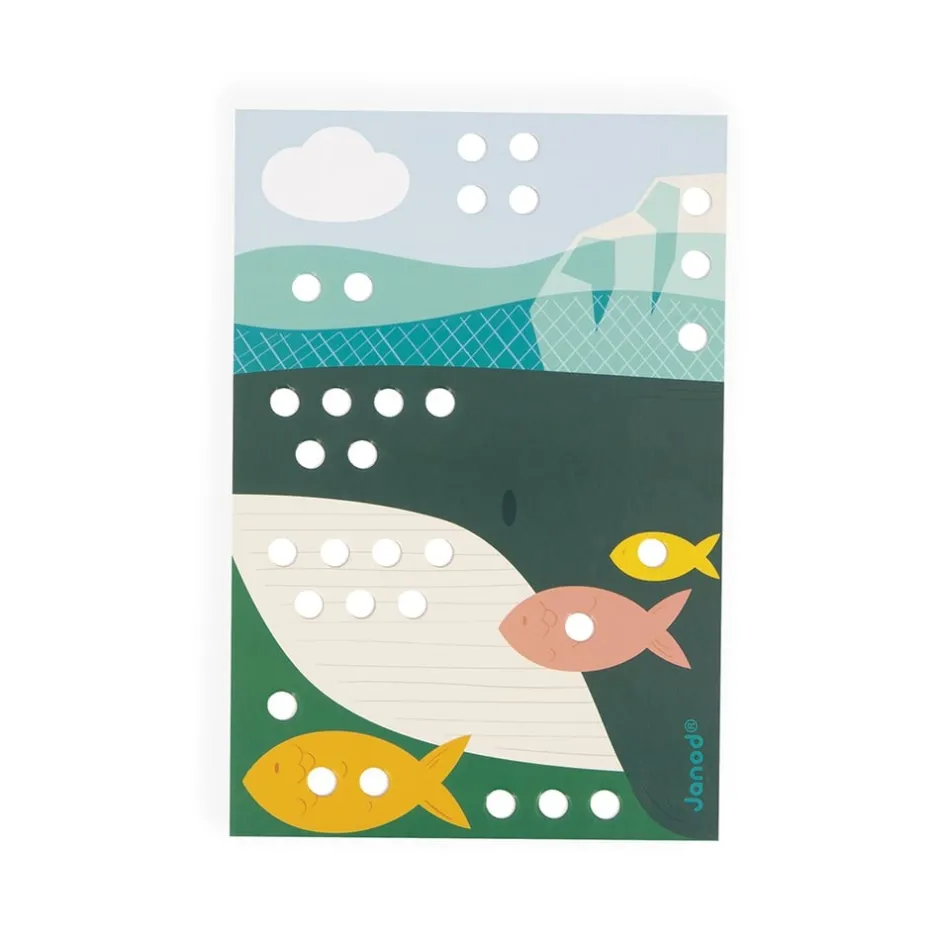 Ce jeu contient : 7 cartes perforées en carton et 70 pièces en bois.