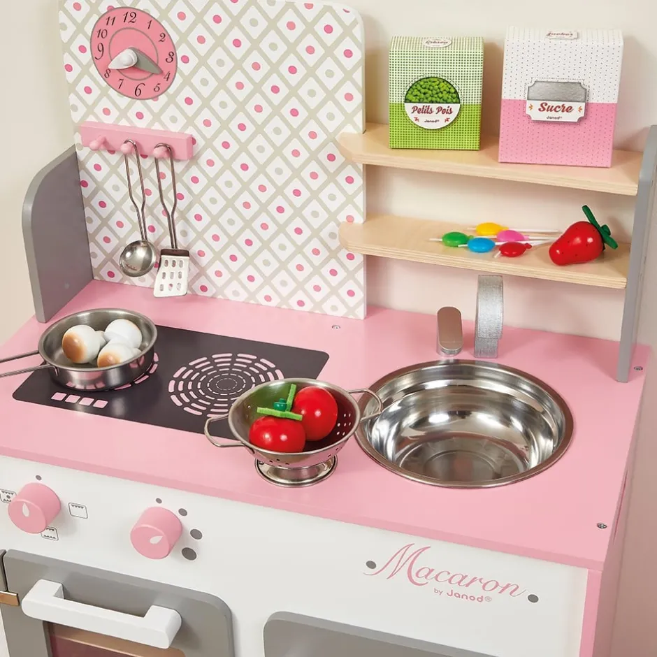 C’est le cas de cette belle Cuisine Macaron en bois, aux couleurs tendres et aux jolis motifs ! Tout à fait adaptée aux enfants à partir de 3 ans, ce beau jouet d’imitation intègre beaucoup de fonctionnalités et d’accessoires : une patère en bois pour suspendre les 2 cuillères en métal, 1 poêle en métal et 2 boites d’aliments en carton (petits pois et sucre) à placer sur les petites étagères. Grâce à cette cuisine complète (hauteur du plan de travail : 50 cm), les enfants pourront également s’amuser avec le four et ses 2 boutons rotatifs avec bruitage, les 2 plaques à induction, le placard avec portes magnétiques, l’évier en inox et l’horloge pour surveiller la cuisson du gâteau au chocolat !