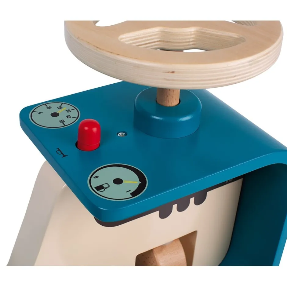 Assis au volant de cet engin agricole, stable et proposant un maintien solide, votre petit bout de chou aura fière allure. Le premier exercice sera déjà de l’enfourcher et de réussir à en descendre. Puis ces mouvements bien acquis, à califourchon, il pourra commencer à progresser en s’aidant de ses pieds. Les roues directionnelles sont caoutchoutées pour rouler en toute sécurité et le volant permet d’orienter le véhicule. Votre enfant, à partir de 12 mois, renforcera ainsi sa motricité globale et son développement musculaire en sollicitant ses jambes pour déplacer le porteur et ses mains pour le diriger. Il sera donc incité à s’orienter et à découvrir par lui-même le monde qui l’entoure. Avec le klaxon qui avertit de son approche, la jauge d’essence et le compteur de vitesse, le réalisme de ce jouet en bois aux formes douces et arrondies est renforcé, ce qui facilite la projection dans des jeux de rôle et la mise en scène de scénarios grâce au jeu libre.