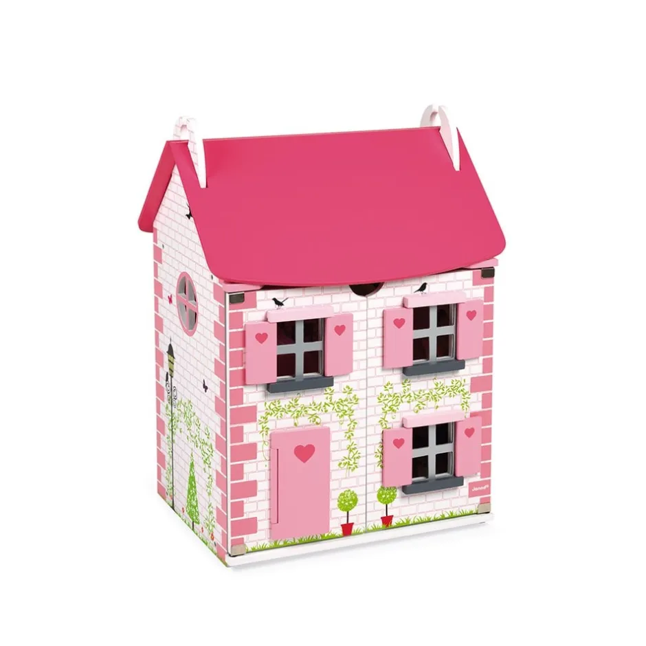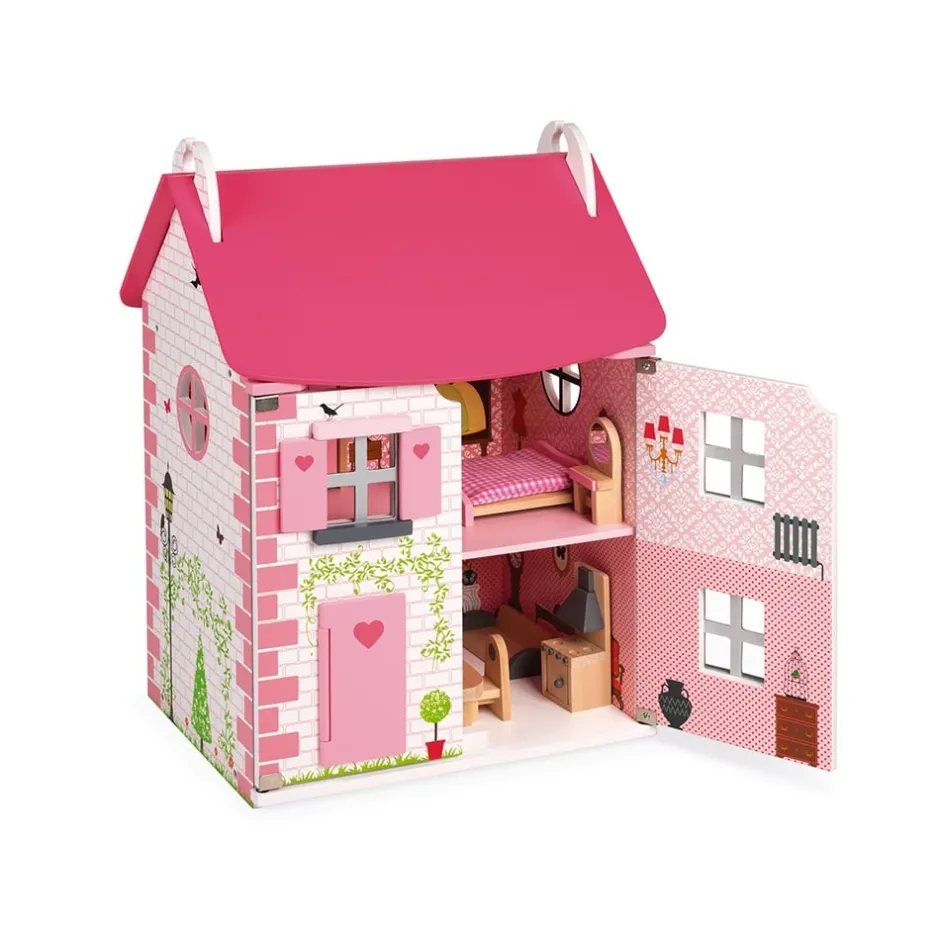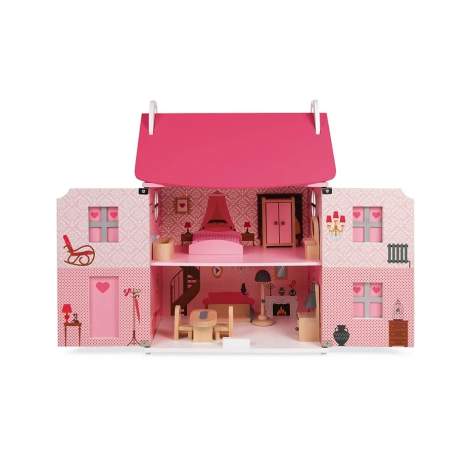 Avec cette maison de poupées équipée dans les tons de rose, votre enfant pourra mettre en scène toutes ses plus belles histoires. Ici rien n’est figé ! Les agencements de mobilier se font et se défont au gré des envies, les pièces peuvent changer de fonctionnalités, les portes magnétiques peuvent être tantôt ouvertes tantôt fermées, le toit donnant accès au 3ᵉ étage peut lui aussi être soulevé ou bien abaissé. À chaque histoire sa configuration.