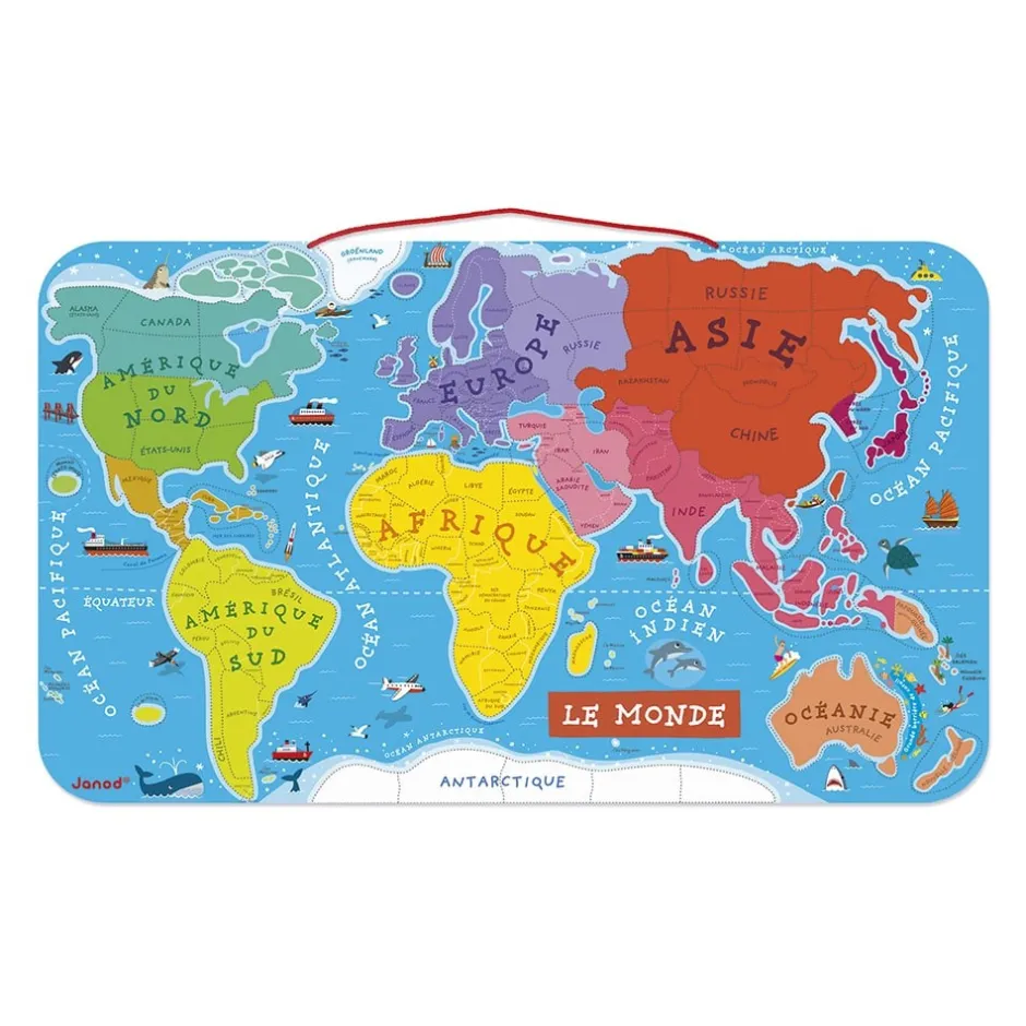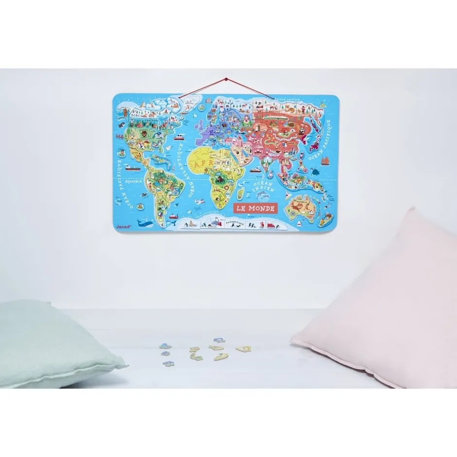 En route pour le tour du monde en 92 magnets ! Offrez à vos enfants de la culture ludique ! Chaque magnet représente un pays ou une région du monde, avec son nom, sa capitale et une illustration caractérisant cette partie du globe. Les enfants vont s’amuser à remettre chaque pays à sa place et obtiendront une magnifique carte du monde à accrocher au mur. Le grand tableau magnétique représente le monde avec ses continents, ses mers, ses océans : la couleur utilisée pour chaque région permet de se repérer. Une façon ludique et pédagogique de découvrir la planète. 92 magnets. Ficelle en coton pour accrocher le puzzle au mur.