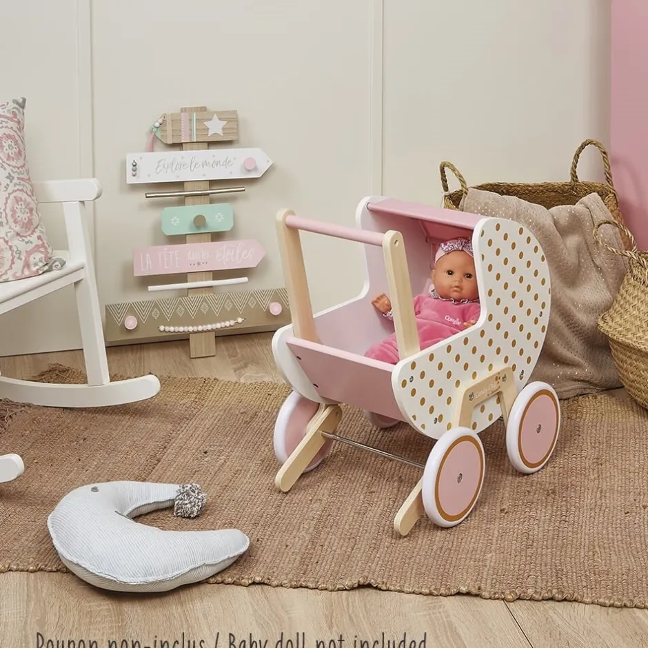 Les poupons seront confortablement installés dans ce magnifique landau aux tons roses et dorés pailletés de la collection Candy Chic ! Comme un véritable landau, ce jouet d’imitation en bois accompagnera votre enfant à partir de 18 mois dans ses premières balades avec ses bébés chéris. Il pourra imiter papa, maman ou sa nounou lors des sorties en plein air. Les roues silencieuses en caoutchouc ne tâchent pas les sols. Pour une sécurité optimale, le landau Candy chic est équipé d’un système anti-bascule amovible que vous pourrez retirer lorsque votre enfant se sentira plus à l’aise dans sa démarche. Avec ce landau, vous trouverez une couverture et un oreiller pour que doudous et poupées soient installés bien confortablement et soient bien au chaud. Les axes des roues sont en métal pour plus de solidité et la capote est en tissu rose. Jouet à monter soi-même. Compatible avec les poupons jusqu’à 42 cm (poupon non fourni).