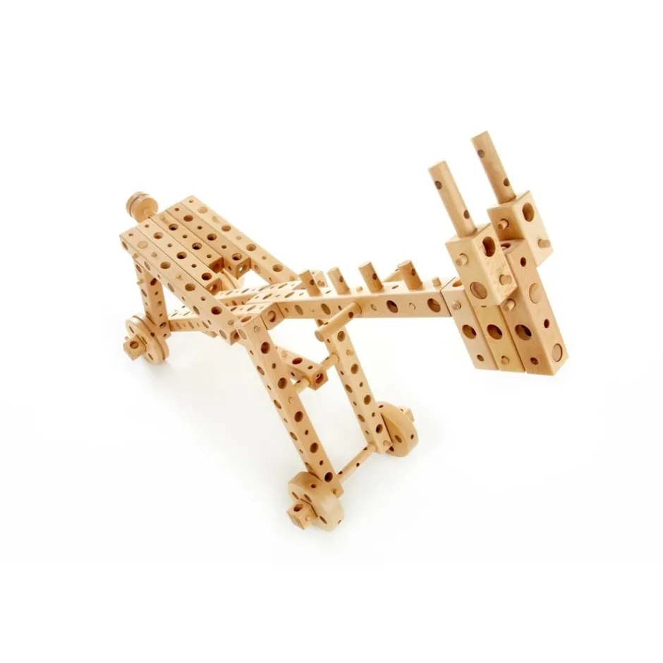 Construisez votre jouet en bois et enfourchez-le ! Avec cet ensemble de construction, votre enfant pourra assembler 7 jouets en bois : un cheval, un kart, une mini-voiture, un tricycle, un pousse-pousse rickshaw, une locomotive et une grue. Ce jouet n’est pas destiné aux petits joueurs, mais plutôt aux petits créateurs. Outres les modèles mentionnés dans le manuel, l’enfant peut utiliser son imagination pour développer sa créativité et concevoir de nouveaux jouets. Garçons ou filles peuvent jouer en solo ou en équipe, ainsi ce jeu les incite à la participation active et au jeu en groupe (collaboratif et coopératif). Ce jouet aide les enfants à stimuler leur concentration et leur visualisation 3D à travers la compréhension de concepts techniques. Ce jouet aide aussi à améliorer la motricité fine des petites mains.