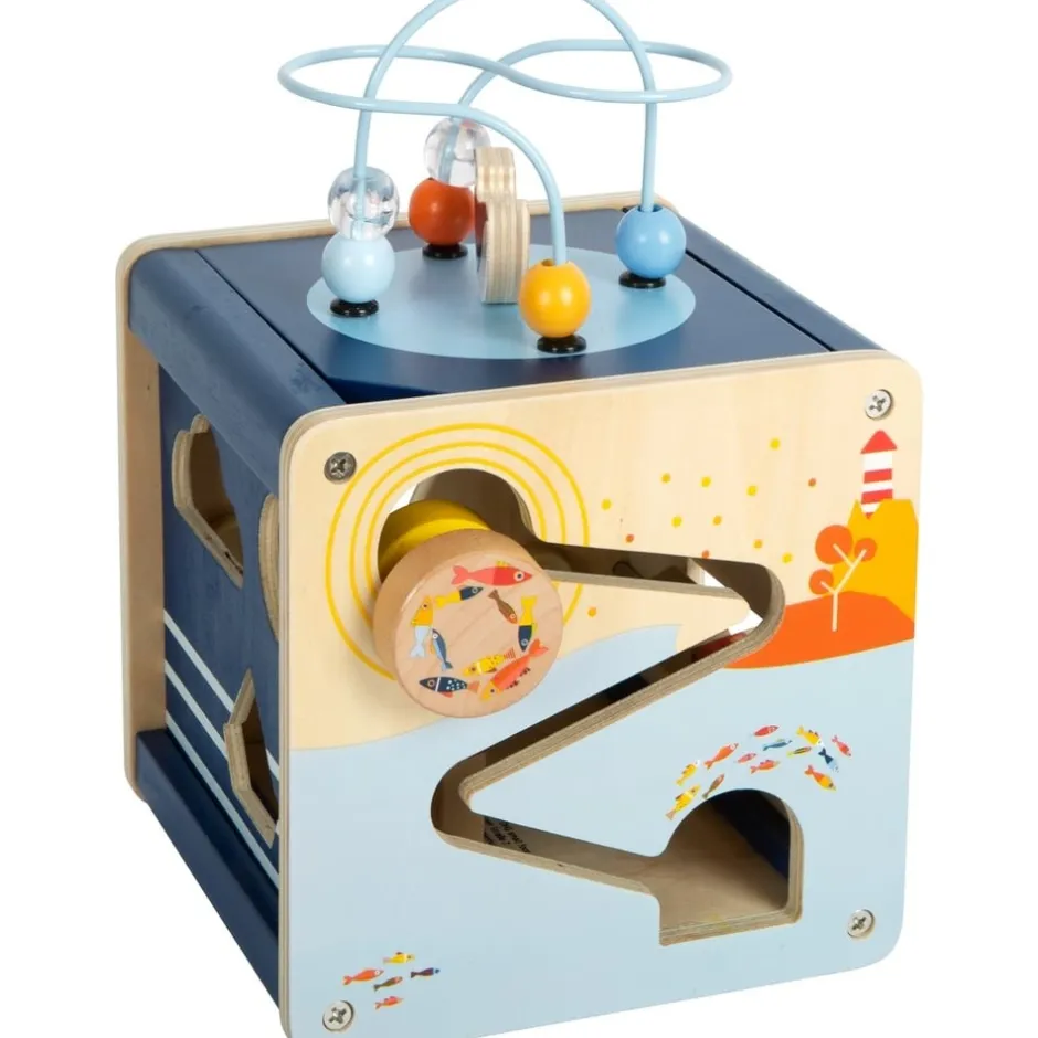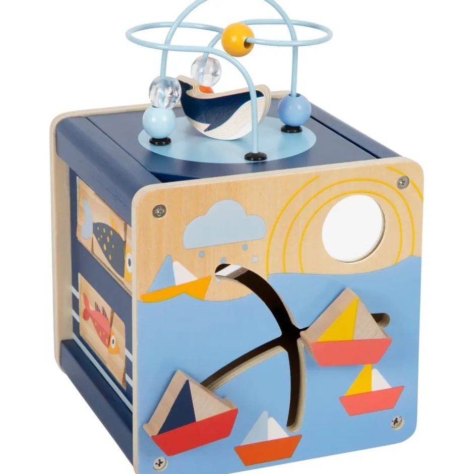 Avec deux circuits de motricité, un jeu à formes, un labyrinthe coulissant et un jeu de volets rotatifs, ce cube de motricité maritime en bois solide est un outil polyvalent grâce à ses cinq faces jouables pour apprendre et découvrir ! Le cube de jeu aux couleurs modernes entraîne la perception des formes et des couleurs, stimule l’habileté et la motricité fine, améliore la coordination œil-main et stimule l’imagination. De forts contrastes de couleurs ainsi qu’un miroir stimulent le sens de la vue et la reconnaissance de soi chez l’enfant. Le couvercle amovible peut être rangé dans le cube pour gagner de la place.