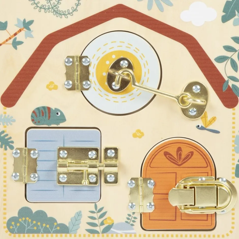 Fermer, ouvrir, découvrir ! Cette planche de motricité en bois offre aux jeunes enfants de multiples possibilités de jeu et d’apprentissage. La planche d’apprentissage au look exotique « safari » dispose de deux fenêtres et d’une porte dotées de différentes fermetures qui laissent entrevoir d’adorables animaux. En ouvrant et en fermant le verrou, le crochet de porte et le loquet, les enfants apprennent des compétences pratiques quotidiennes et développent leurs capacités motrices fines.