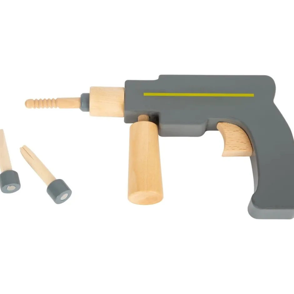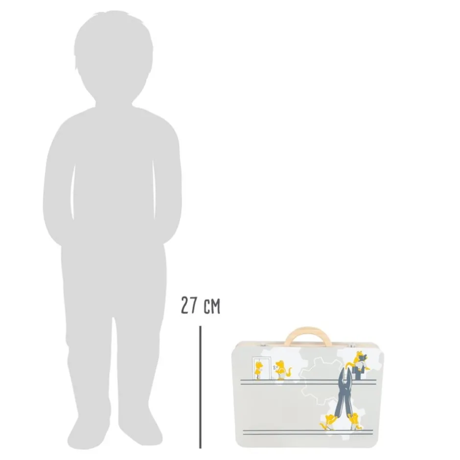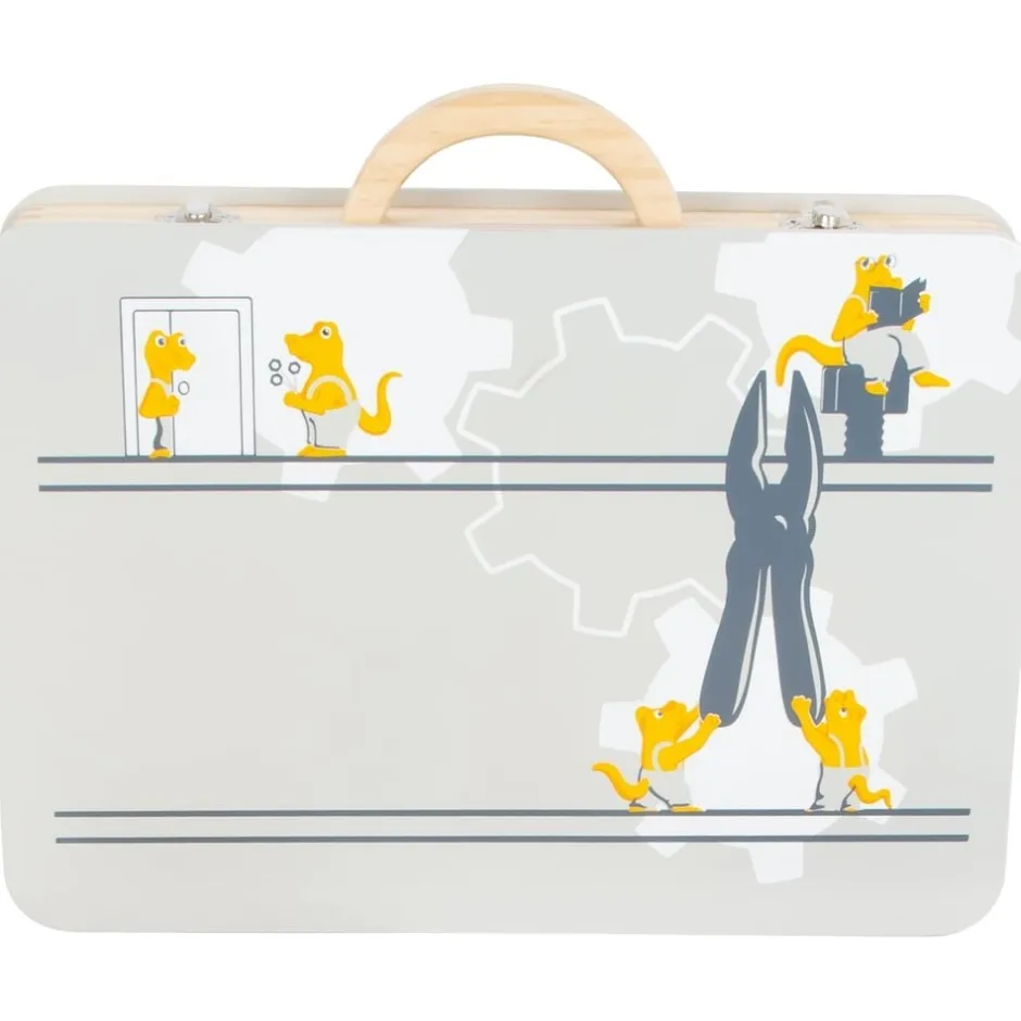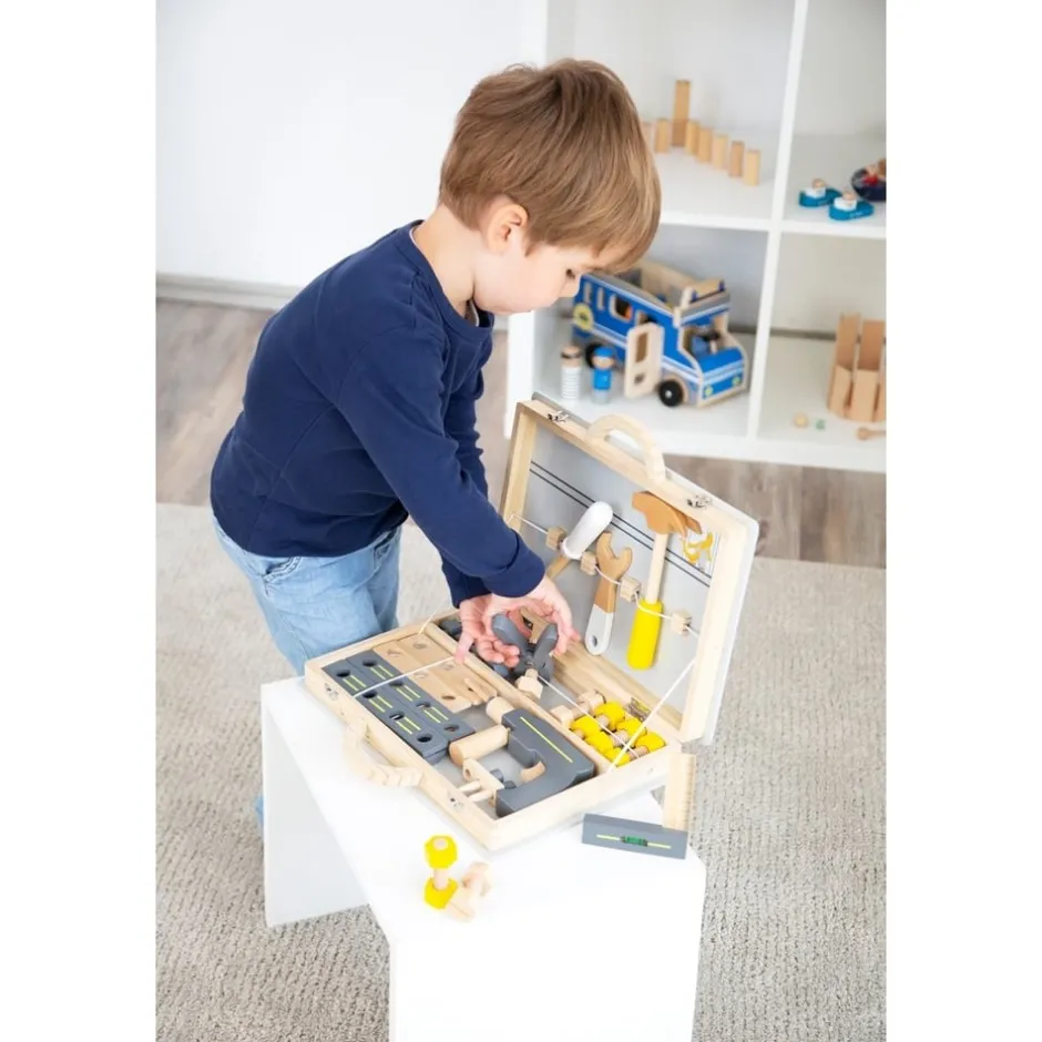 En imitant, votre enfant interagira avec son environnement, il construira ainsi ses structures cognitives et développera sa motricité fine et son langage. Le fait de jouer d’autres rôles lui permettra de prendre conscience de l’existence de l’autre, mais aussi de lui-même et de jouer en interaction. Les jeux d’imitation sont essentiels dans le développement de l’enfant et plus les jeux sont réalistes, plus l’enfant va les investir. C’est ce qui fait de cette mallette de bricolage le jeu en bois parfait pour votre petit bout de chou. Cette boîte à outils en bois comprend 43 répliques d’outils et d’accessoires très réalistes : un tournevis, un marteau, une pince, une clé, une perceuse et ses 3 embouts aimantés, une règle avec niveau à bille, des vis, écrous et plaques perforées. Grâce à cette mallette à outils transportable partout, votre bambin pourra accompagner et aider le bricoleur de la famille dans ses petits travaux, observer ses gestes (visser, marteler, percer, mesurer, tourner, fixer…), les reproduire, puis se lancer seul dans ses propres missions de bricolage.