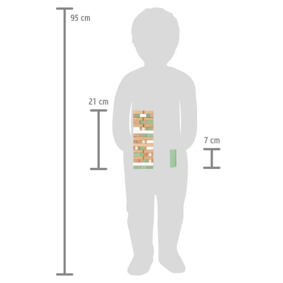 Le principe du jeu est très simple et assure le plaisir et la bonne humeur des petits et des grands ! Il faut avant tout faire preuve de concentration et d’intuition lorsqu’il s’agit de retirer tour à tour les blocs de construction en bois de la tour et de les replacer au sommet sans que la tour ne s’effondre. Le dé indique quelle brique doit être retirée ensuite. Frisson inclus… Le degré de difficulté et le déroulement varient, car on peut jouer avec ou sans dé !