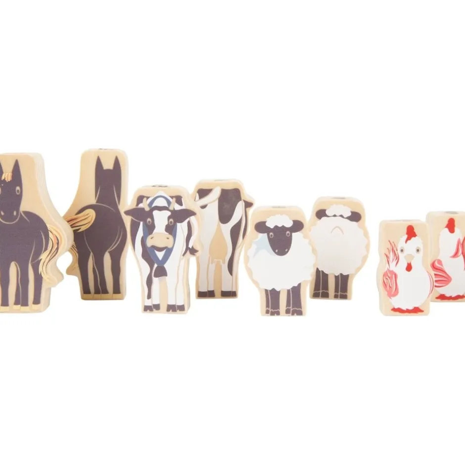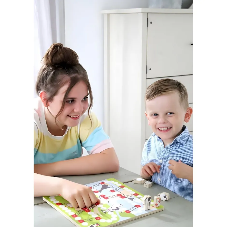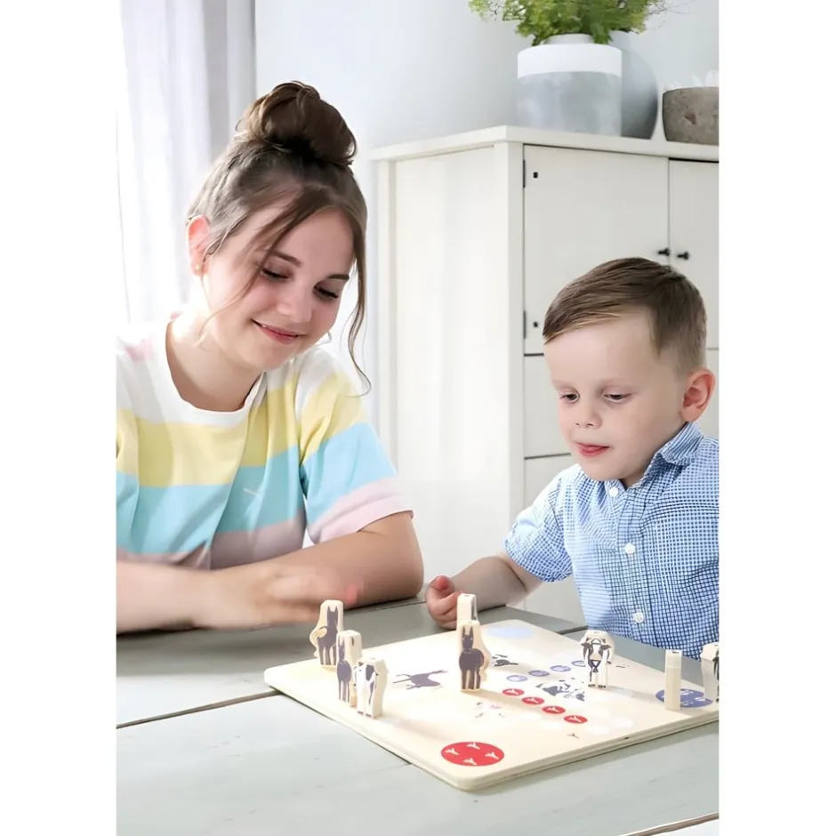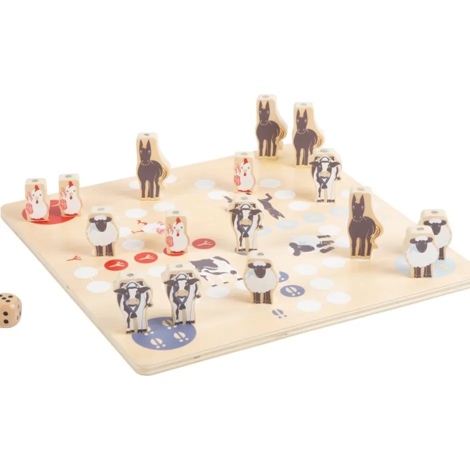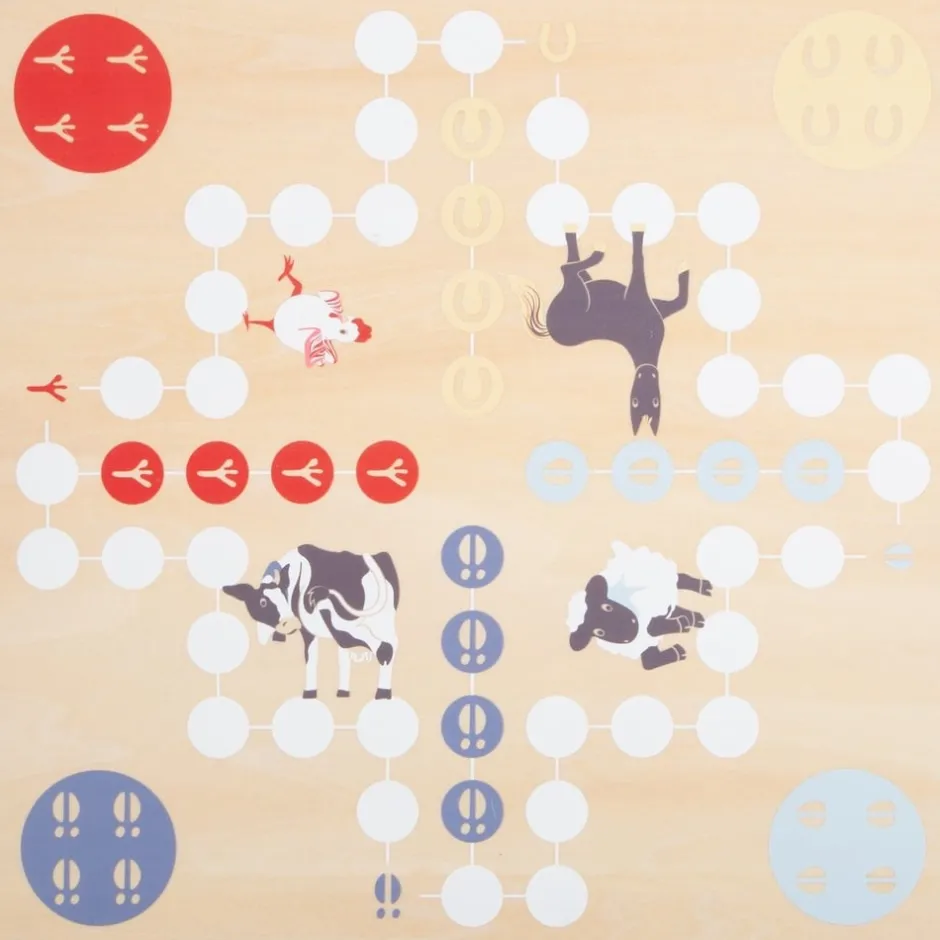 Contenu : 2 plateaux de jeux en bois réversibles, 4 vaches, 4 chevaux, 4 poules, 4 moutons, 1 un dé de chiffres et une boîte de jeu de haute qualité pour le rangement.