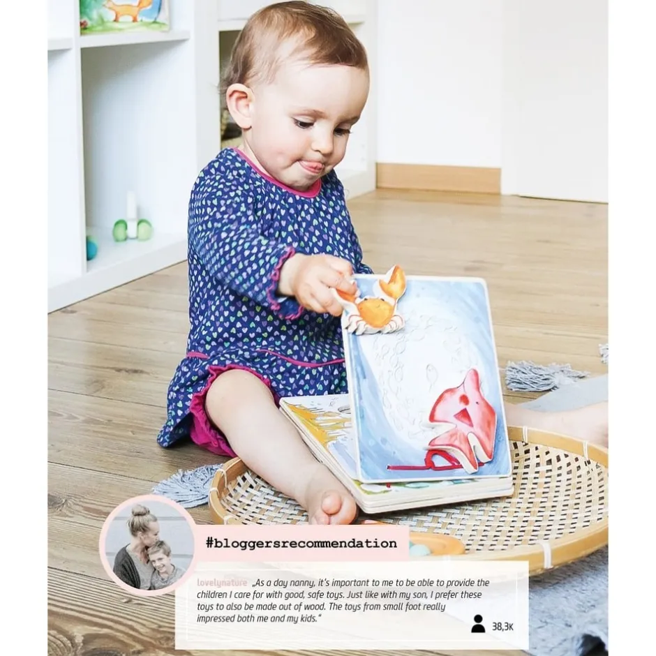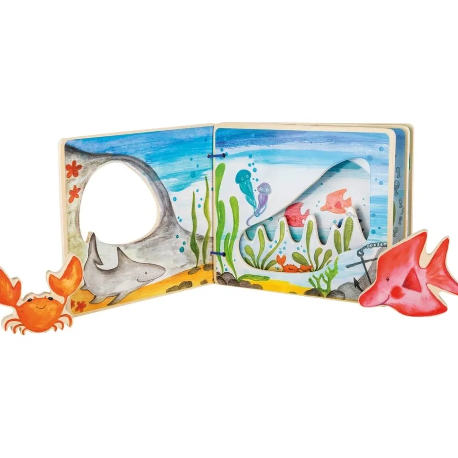 Ce très joli livre en bois aux illustrations douces et colorées contribuera à stimuler le langage et à enrichir le vocabulaire de votre bébé. Ce livre d’éveil sera aussi le compagnon indispensable de votre rituel du soir permettant ainsi de développer votre lien affectif avec votre petit ange et lui apportant un petit moment de tendresse apaisée privilégié. Un parfait outil pédagogique qui contribuera à affiner la motricité fine de votre enfant par la manipulation du livre, par l’exercice de tourner les pages ou de faire se mouvoir les petits comparses crabe et poisson au gré des pages. Par la lecture de ce très joli ouvrage vous offrirez à votre bambin une fenêtre ouverte sur l’imaginaire, le fantastique et la rêverie. Avec ce livre en bois pour bébé, les enfants partiront dans un beau voyage à la découverte du monde sous-marin de manière amusante, tout en stimulant son éveil et son imagination. Le poisson et le crabe peuvent effectuer une plongée à travers les ouvertures des pages en bois colorées. Après la plongée, les deux amis peuvent être simplement attachés au dos du livre avec l’attache de type Velcro.