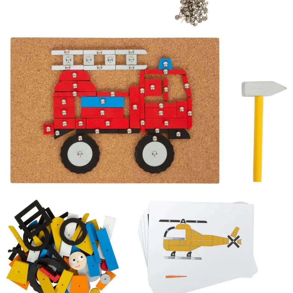 Ensemble créatif complet sur le thème de la mobilité, des véhicules et des scènes de l’environnement urbain ! Équipé d’une planche en liège, d’un marteau en bois, de clous décoratifs et de nombreux éléments en bois stratifié, ce jeu de marteaux permet de créer de nombreux motifs.