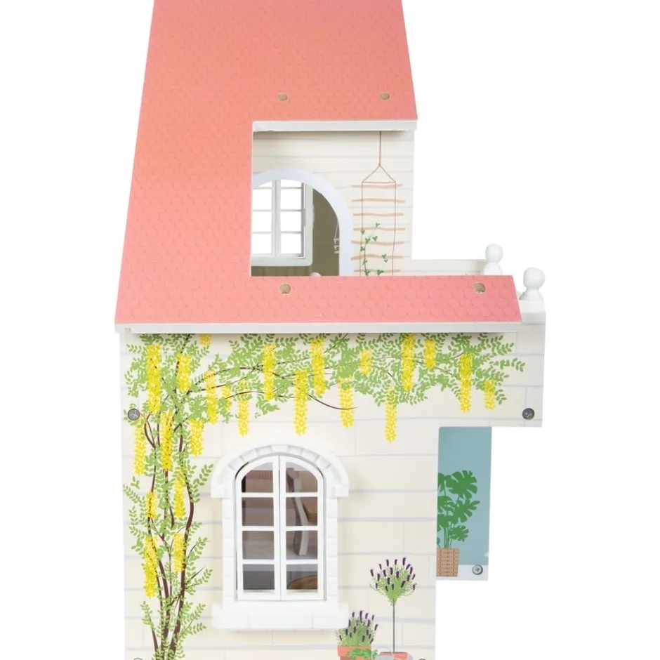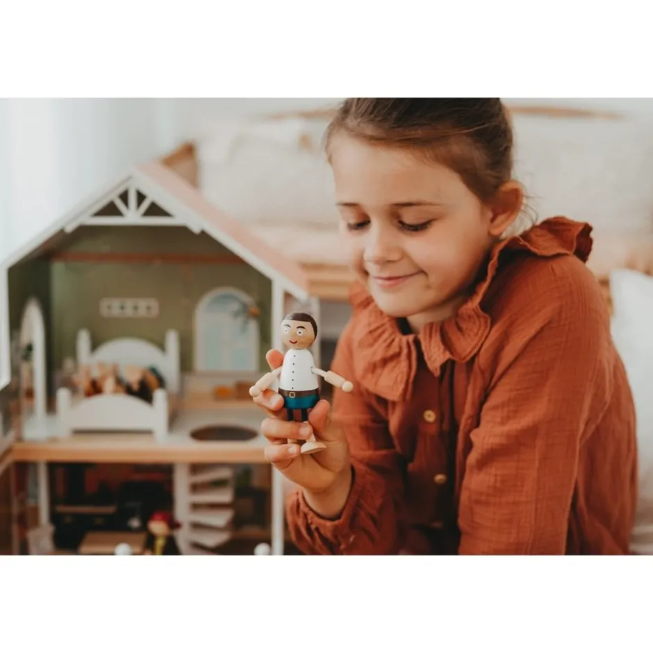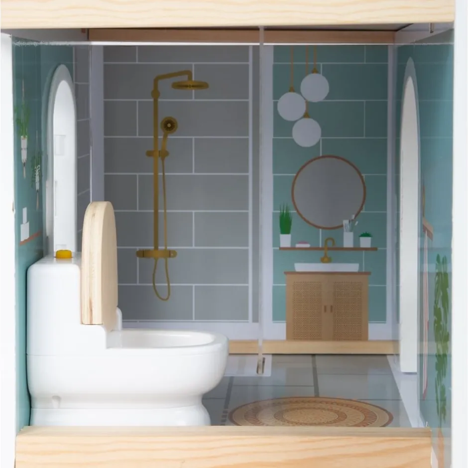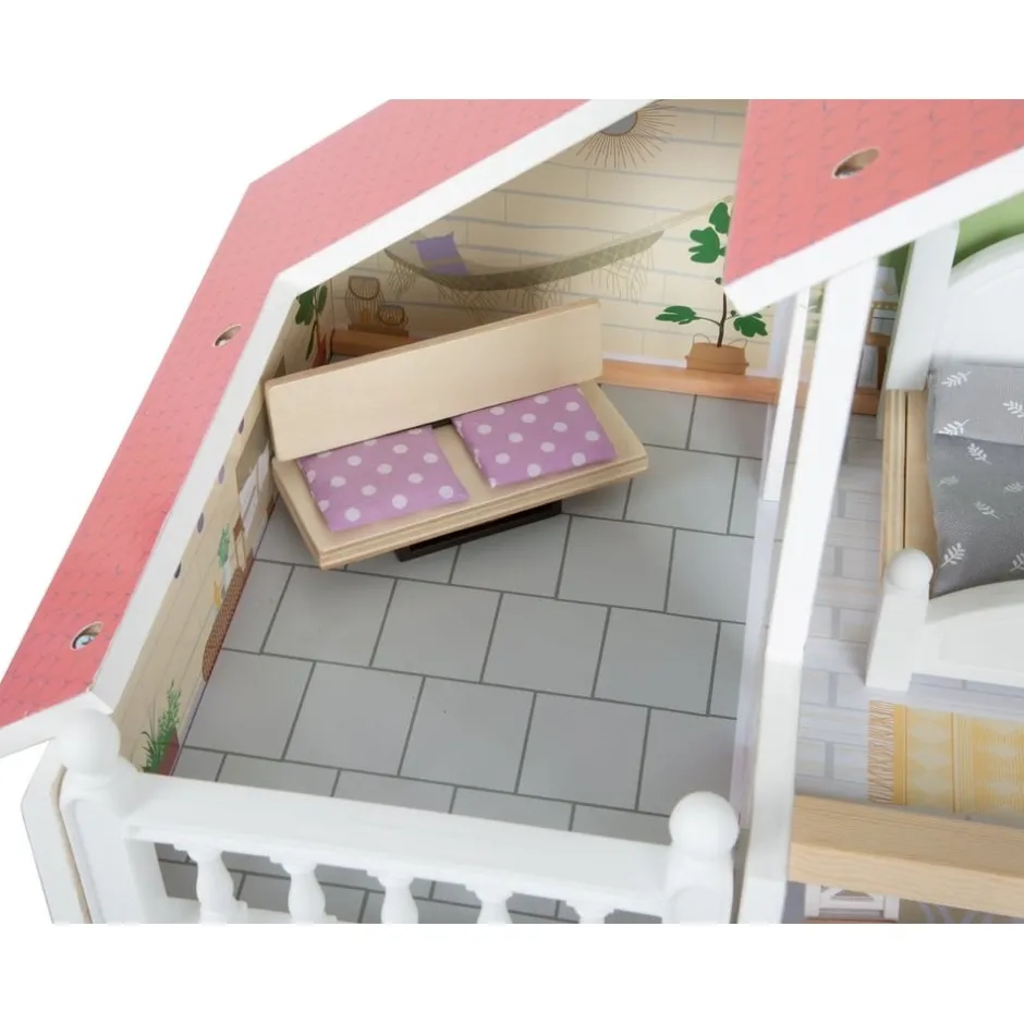 Cette maison de poupée moderne en bois avec façade ouverte convainc par ses détails de conception, ses accents décoratifs et son style de vie moderne. Le salon avec cuisine et salle à manger, la chambre et la salle de bain ainsi que la terrasse sur le toit et le jardin de devant offrent toutes les possibilités pour un jeu imaginatif et un jeu de rôle actif. Le concept d’habitation ouvert, l’escalier en colimaçon, les fenêtres à ouvrir et une douche moderne de plain-pied avec une paroi de douche en verre acrylique font de la maison de poupée, avec ses huit meubles fonctionnels et des éléments textiles tels que le linge de lit et les coussins, un élément qui attirera tous les regards dans la chambre d’enfant.