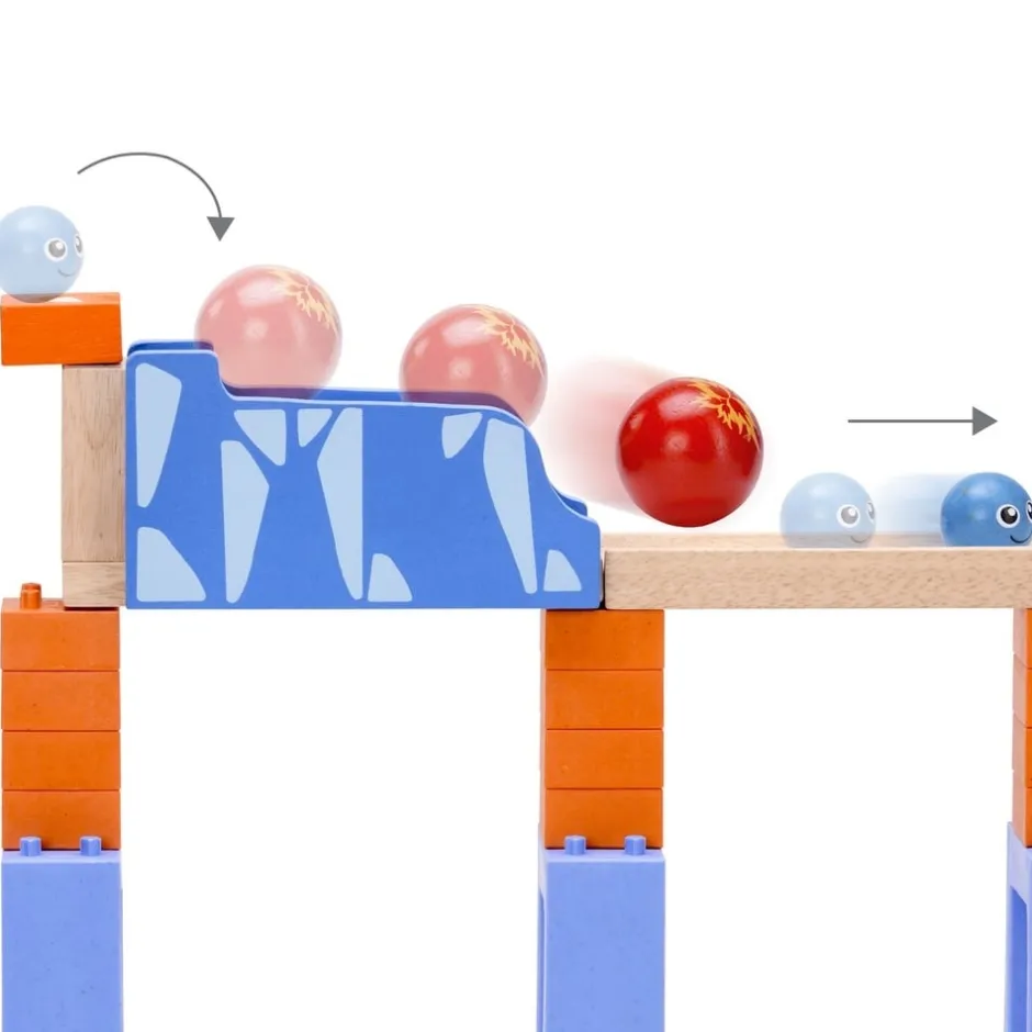 Le circuit à billes en bois Double course est l’assurance pour votre enfant de passer de bons moments à observer la petite bille bleue et la plus grande rouge faire la course, franchir les obstacles, et se frayer un chemin jusqu’à la ligne d’arrivée.